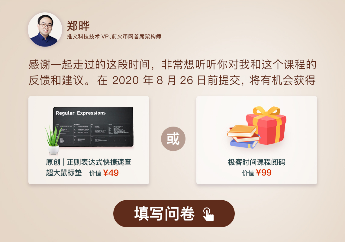 《软件设计之美》课程结束了,这里有一份毕业问卷,题目不多,希望你能花两分钟填一下。期待能听到你说一说,你对这个课程的想法和建议。