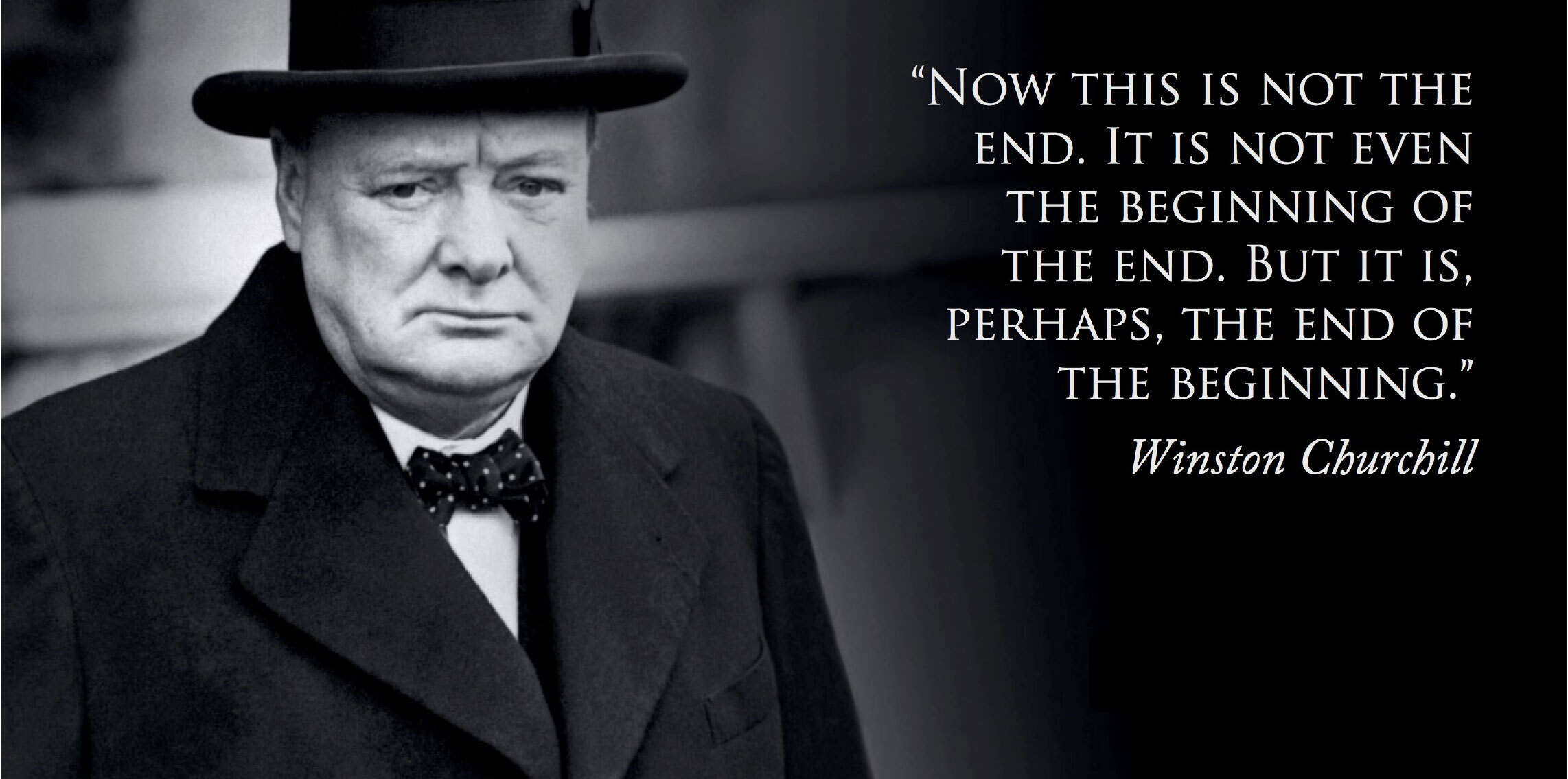 丘吉尔在阿拉曼战役庆功宴上发表的演讲中,说过这样一段话:这不是结束,甚至不是结束的开始,而可能是开始的结束。(Now this is not the end. It is not even the beginning of the end. But it is perhaps the end of the beginning.)