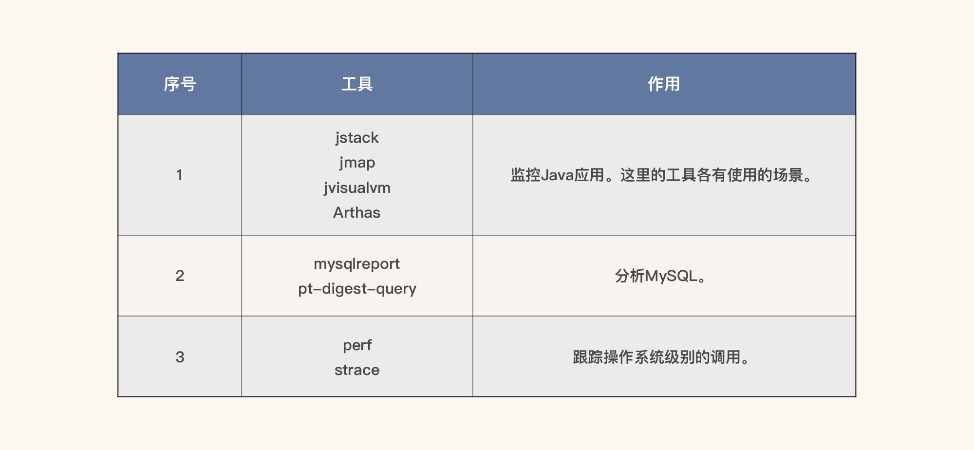 其实在性能分析中,除了表格中的这三个工具之外,还有很多工具会在查找性能瓶颈证据链时使用,我在这里无法全部罗列出来,只能根据系统使用到的技术组件,大概罗列一下我能想到的常用工具。在后续课程的操作中,如果你发现我们用了表格中没有列出的工具,也请你不要惊讶。