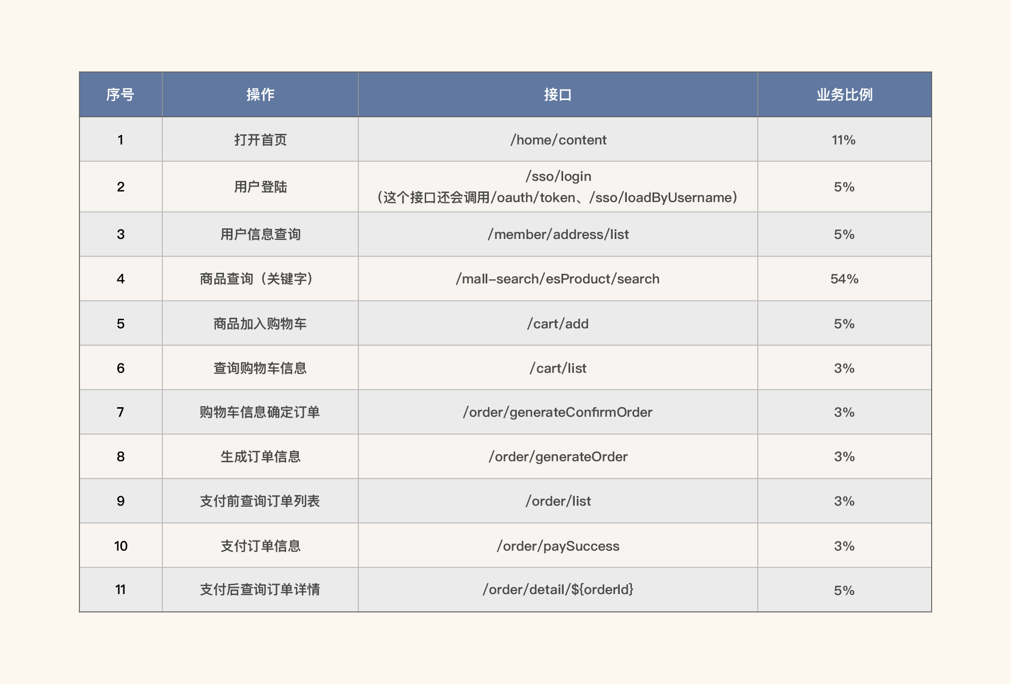 请你注意,这个模型并不是随便填写的,而是直接从生产环境中取得的业务比例。关于如何从生产中取出这样的业务比例,有很多种手段。这个并不复杂,通过统计日志就可以做到。