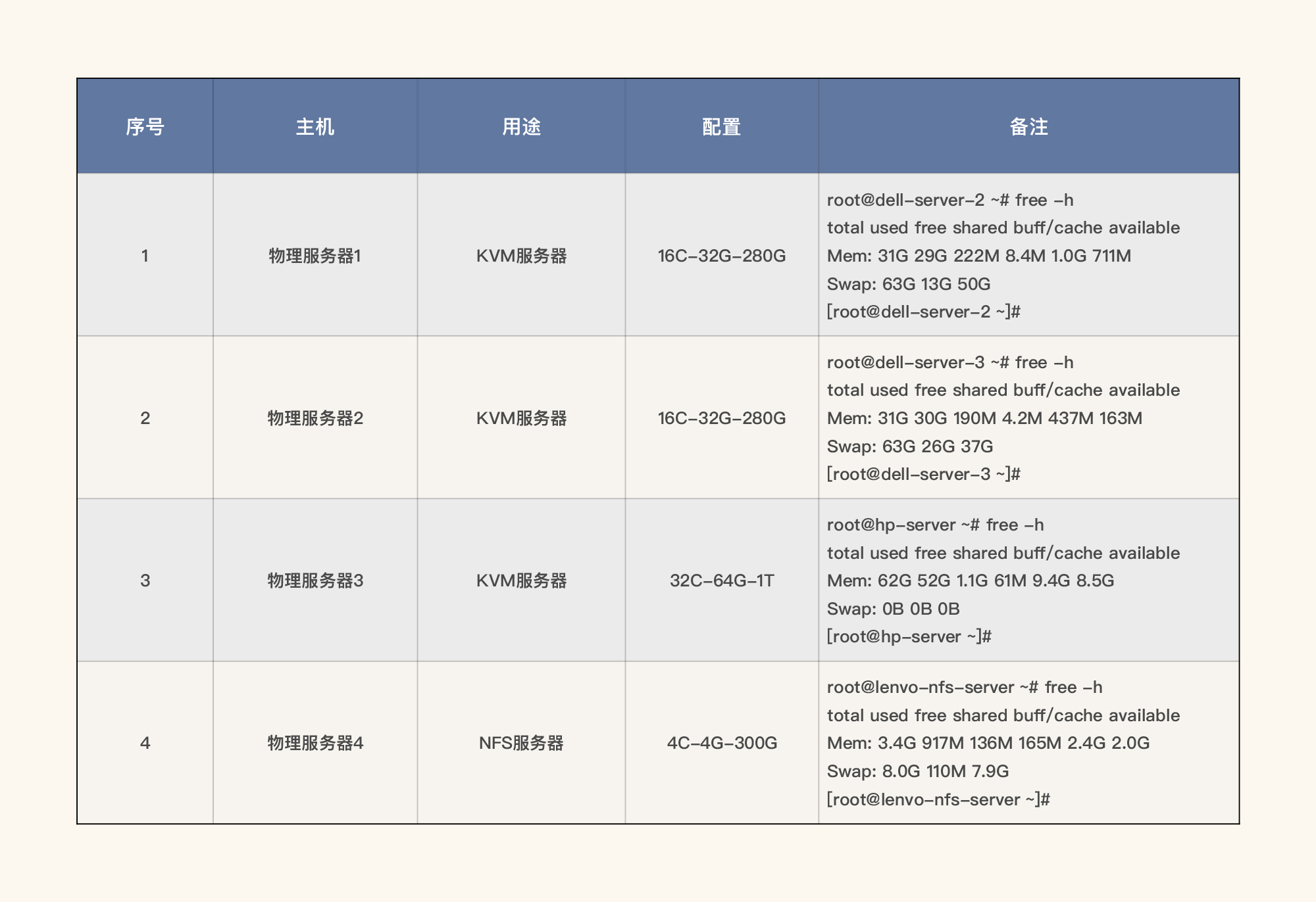 我们可以看到,当前服务器总共使用在应用中的资源是:64C的CPU资源,128G的内存资源。NFS服务器不用在应用中,故不计算在内。因为单台机器的硬件资源相对较多,所以在后续的工作中,我们可以将这些物理机化为虚拟机使用,以方便应用的管理。