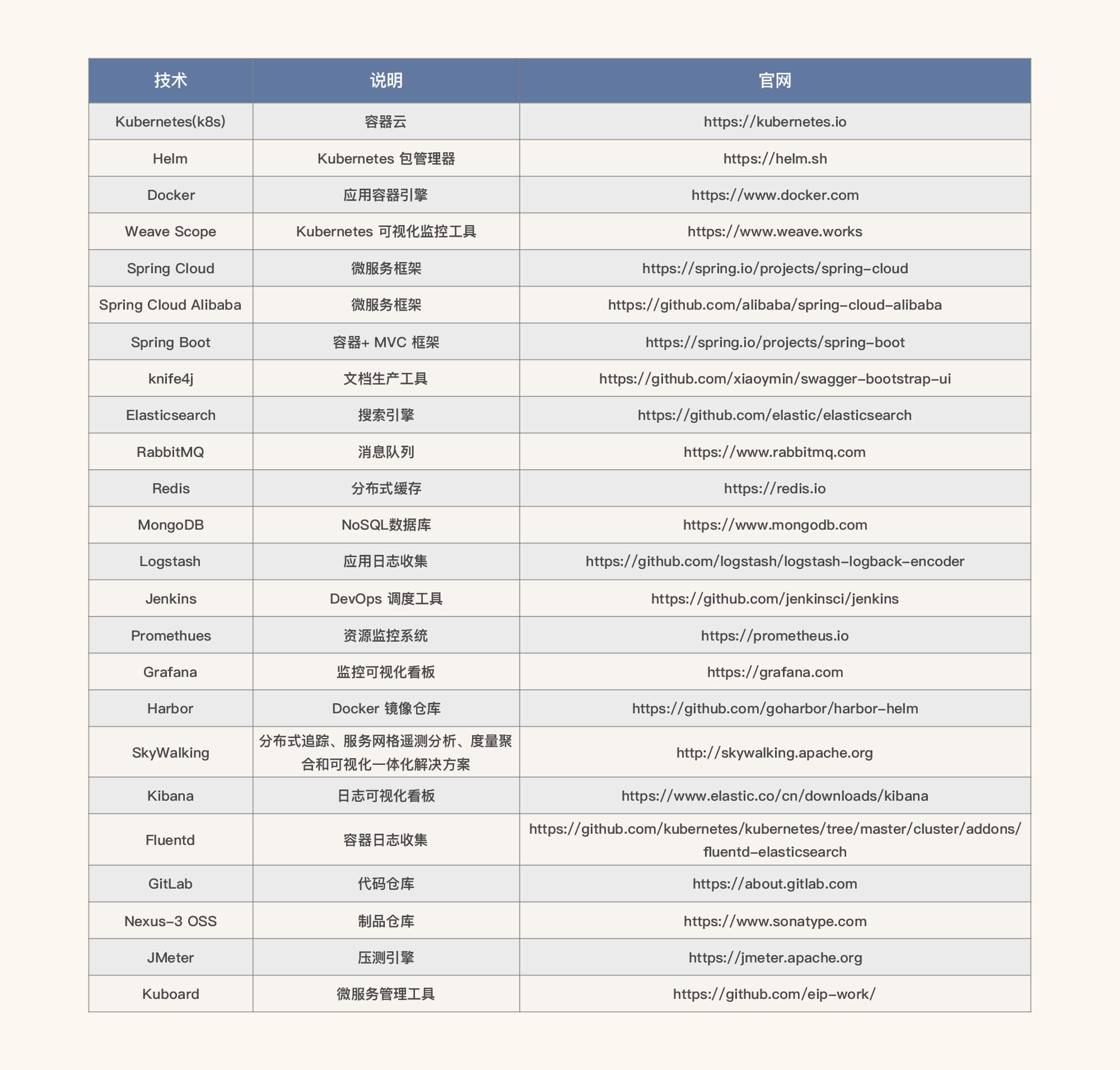 下面这张表格,就是我们在后续课程的案例分析中,会用到的技术栈。我在搭建这个系统时,考虑的是尽量覆盖当前技术市场中的主流技术组件。