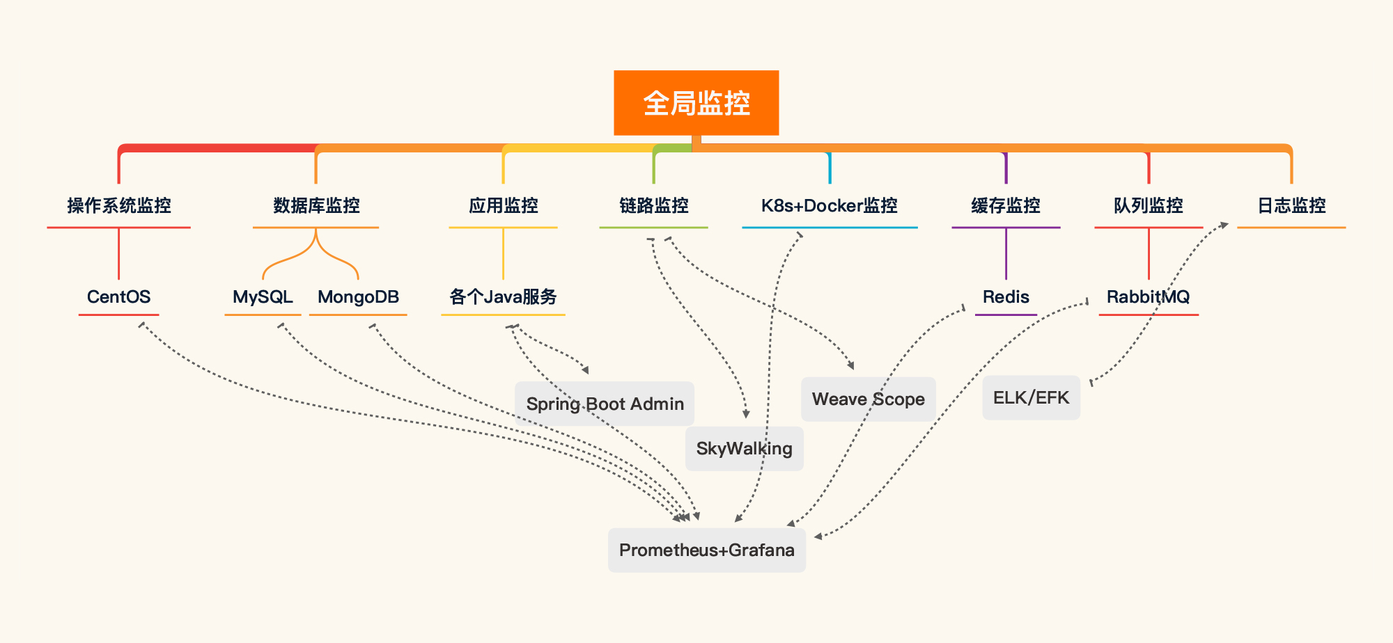 其实,有了前面的监控工具部分,监控设计就已经出现在写方案之人的脑子里了。对于我们这个课程所用的系统,全局监控如下所示: