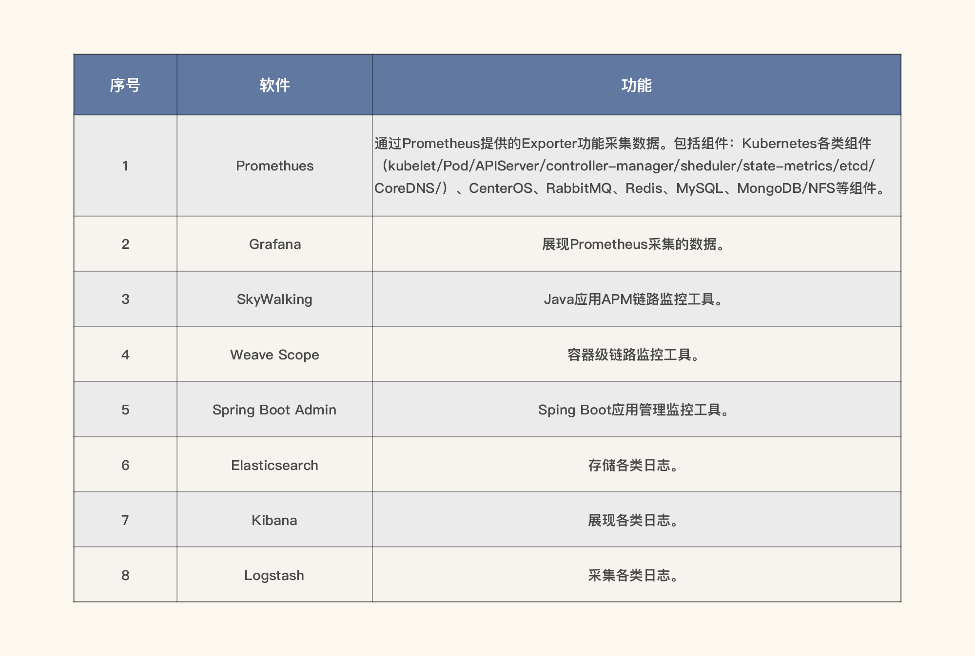 从上图来看,我们使用Prometheus/Grafana/Spring Boot Admin/SkyWalking/Weave Scope/ELK/EFK就可以实现具有全局视角的第一层监控。对工具中没有覆盖的第一层计数器,我们只能在执行场景时再执行命令来补充了。