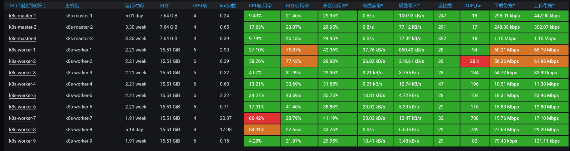 至于worker-1和worker-2的上下行带宽,看起来真是不大。在内网结构中,我们在测试的时候,内网带宽达到过好几Gbps,这点带宽还不足以引起我们的重视。