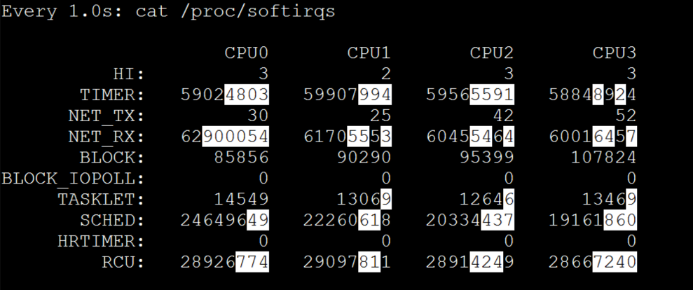 我们进一步来看软中断的变化,既然软中断消耗的CPU高,那必然是要看一下软中断的计数器了: