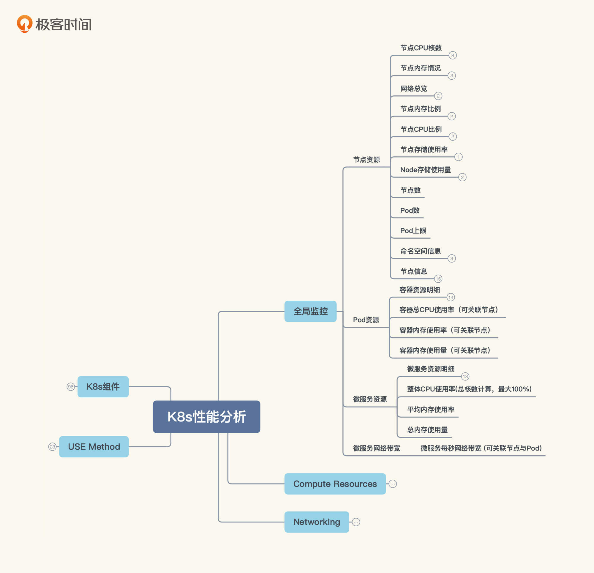 这里我要跟你强调一下,在全局监控的思路中,不是说我们看了哪些数据,而是我们要去看哪些数据。这时候,你就必须先有一个全局计数器的东西。比如说在Kubernetes里,我们就要有这样的思路: