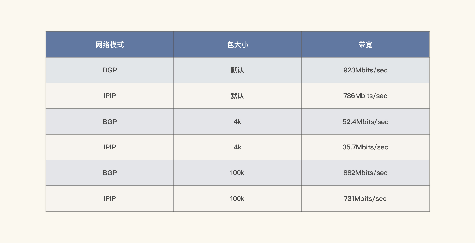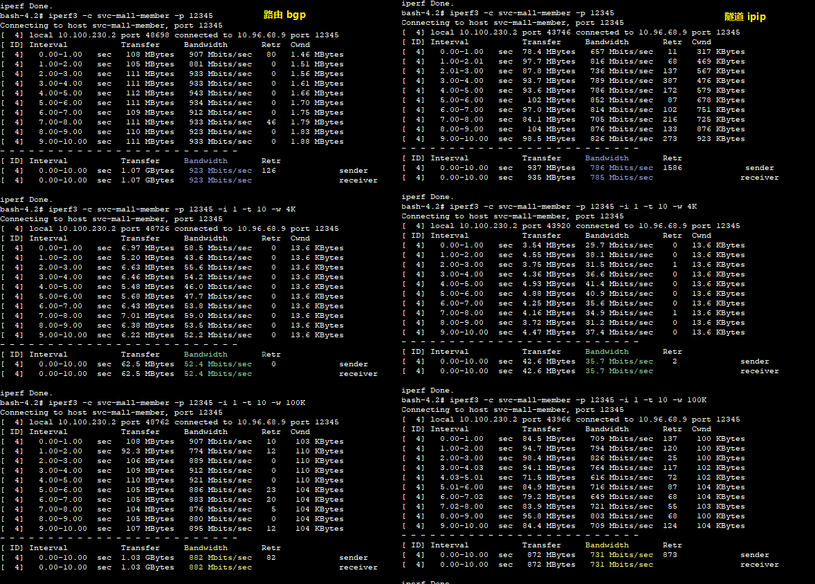 我们把IPIP修改为BGP模式之后,先测试下纯网络的区别,做这一步是为了看到在没有应用压力流量时,网络本身的传输效率如何:
