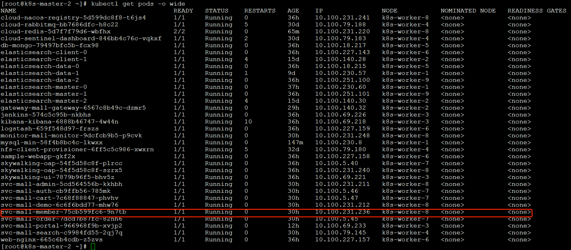 前面我们说是worker-8上的CPU资源用得最多,所以我们来查一下被测的服务,也就是Member服务,是不是在worker-8上。