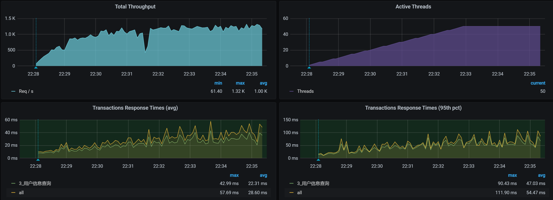 我们先来看用户信息查询的压力数据情况如何。因为我们现在测试的是单接口,而用户信息查询又需要有登录态,所以我们要先跑一部分Token数据出来,再执行用户信息查询接口。