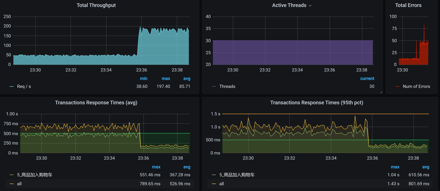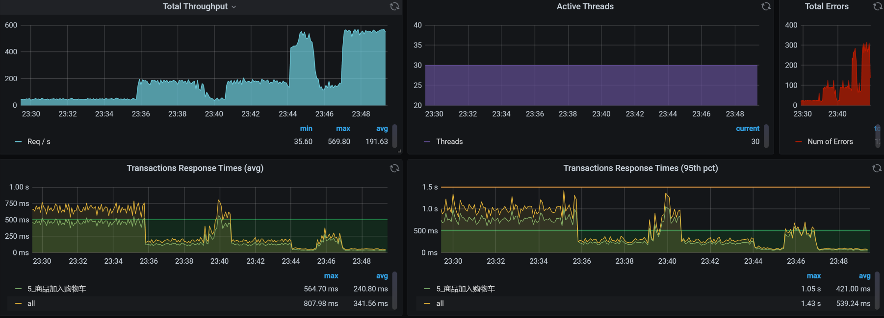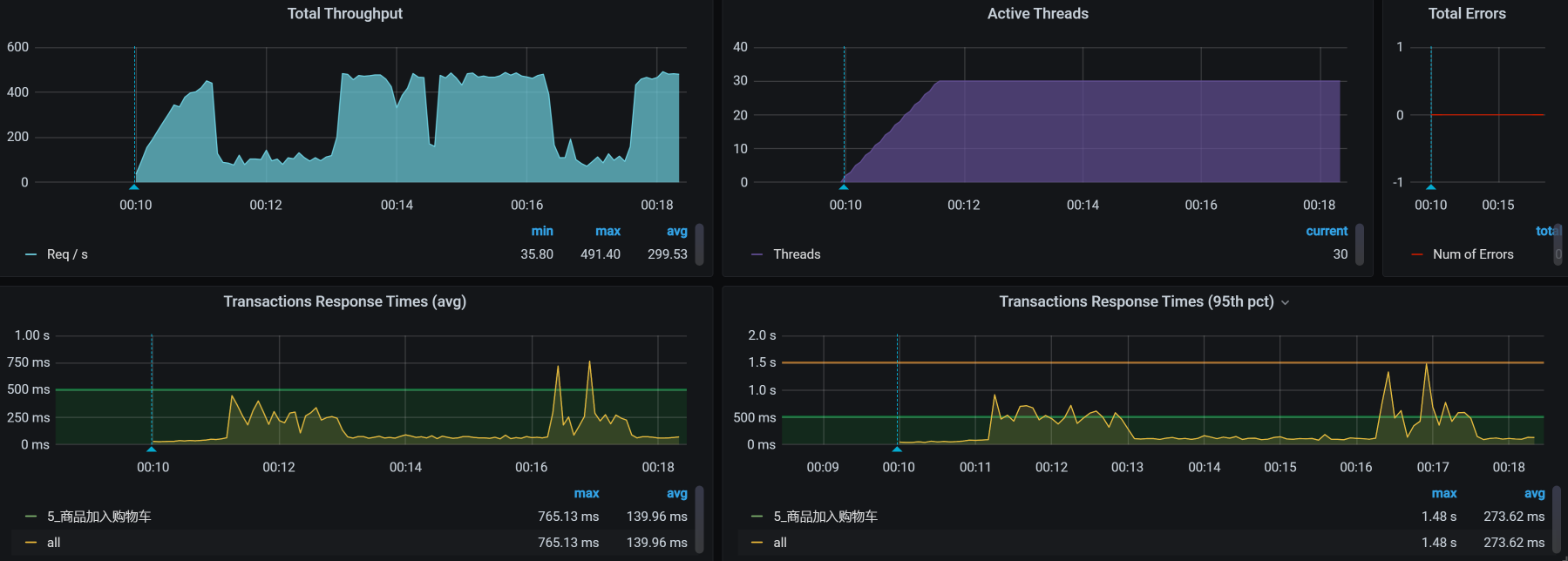 对于商品加入购物车这个接口,我们第一次运行的性能场景结果如下: