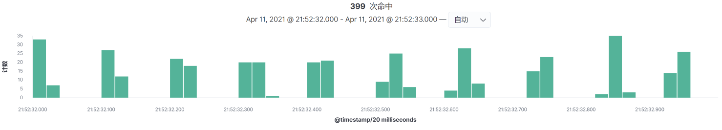 这张图就是我在同样的场景中加了集合点之后,统计了服务端的请求日志,然后细化到以20毫秒为粒度看到的结果。你看,请求的趋势其实是断断续续的,对吧?这已经充分说明了“集合点在服务端的表现到底是怎样的”这个问题。