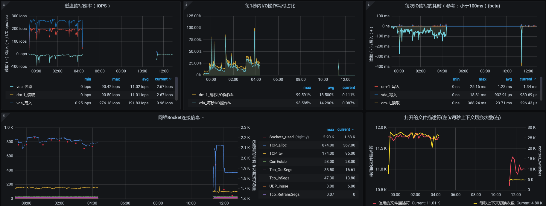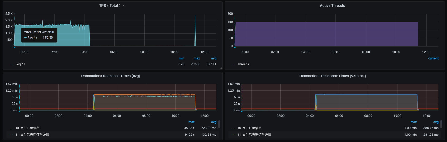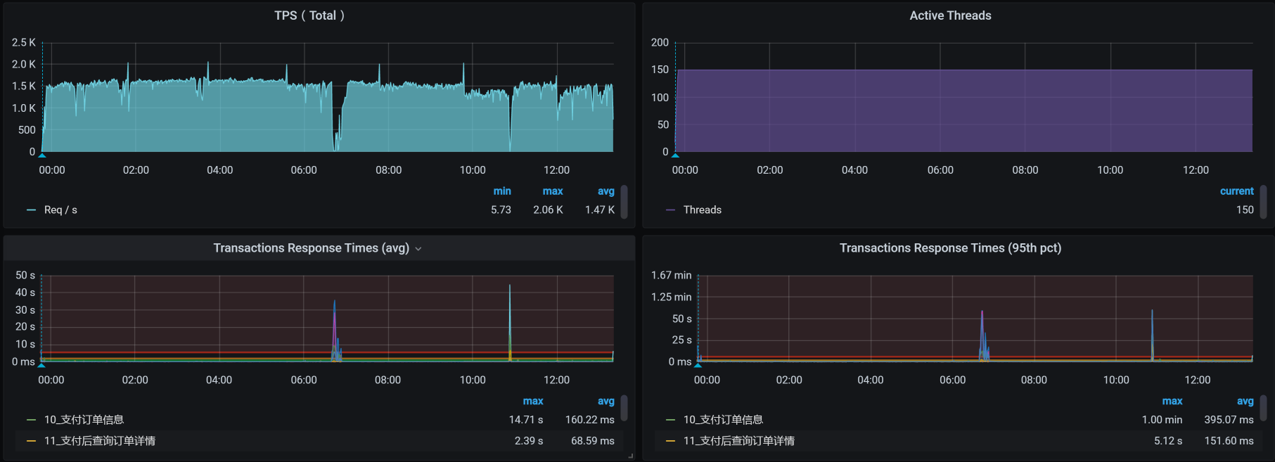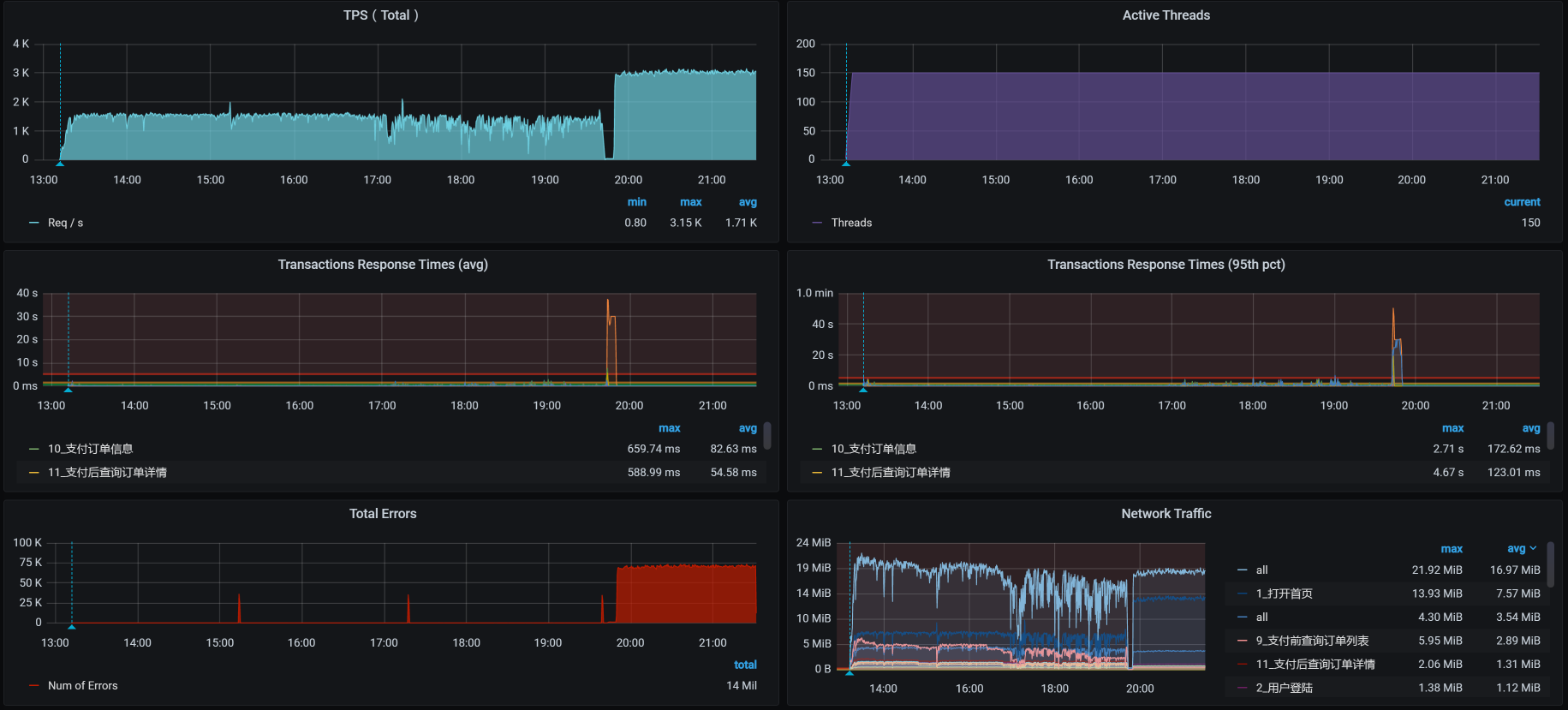 从数据上来看,在稳定性场景运行4个多小时的时候,TPS就没了,响应时间又非常高,这明显是出现问题了。