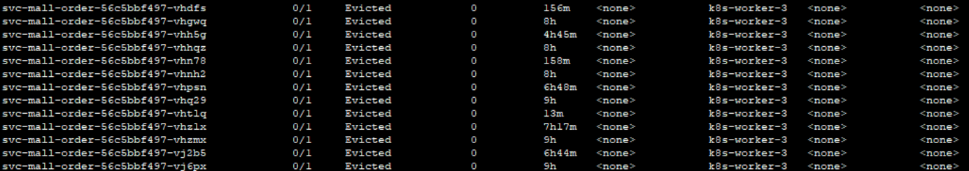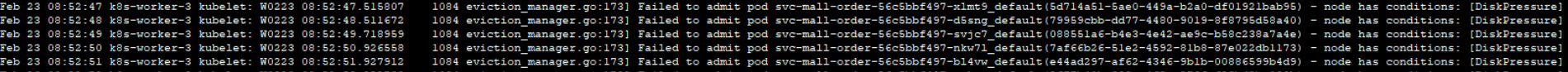 DiskPressure!这就是说Order服务所在的worker上的存储被用完了呗。在Order应用的虚拟机中,我通过查看Kubernetes日志,发现了这样的错误信息: