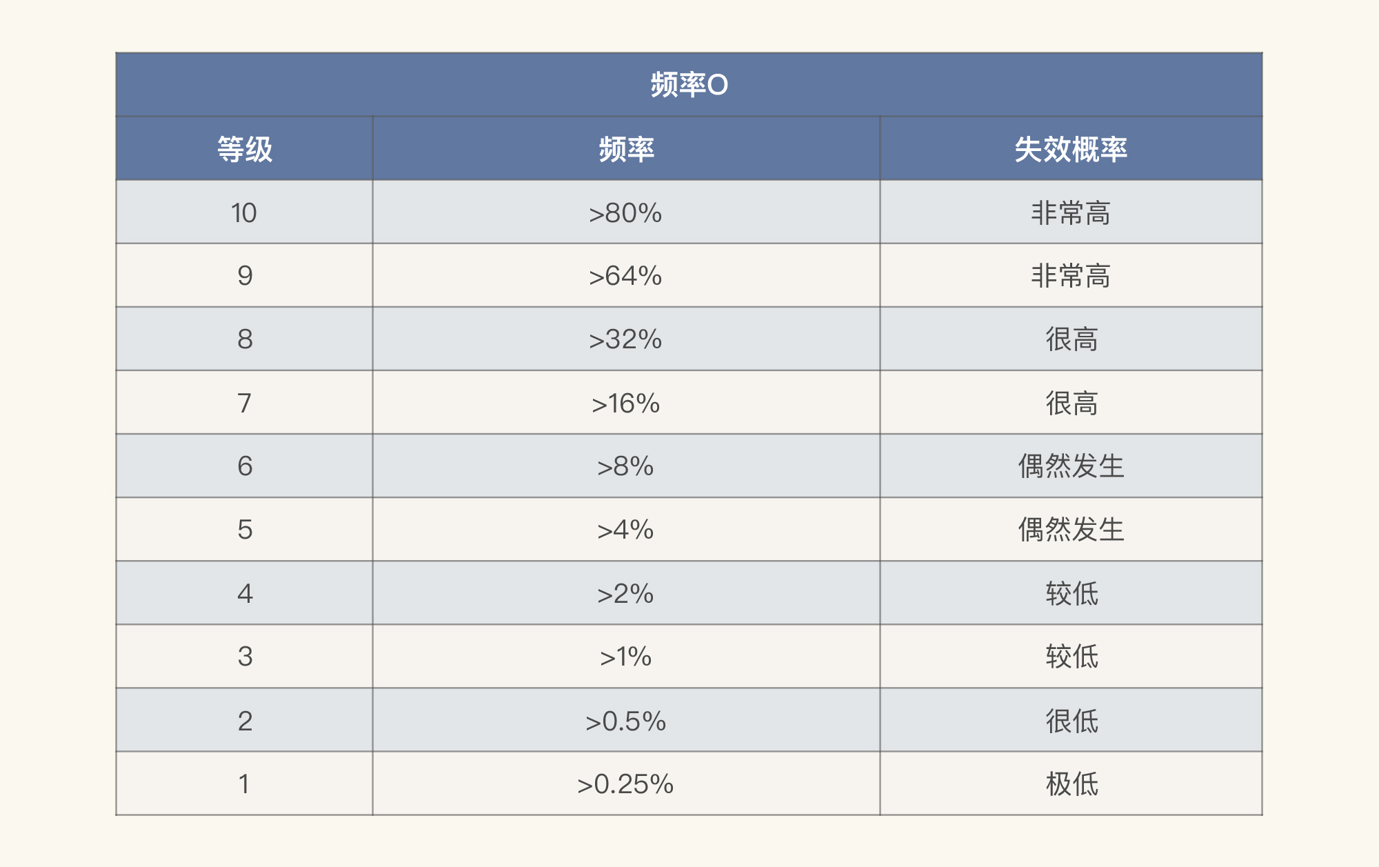 在我们填写这张表格之前,有一点我要说明一下。在FMEA中,严重度、频率、探测度需要各自分级,并且都分为1~10这10个等级。下面我大概列一下这三个方面不同级别的含义。请你注意,我只是描述相对通用的内容,尽量不和业务挂勾。
