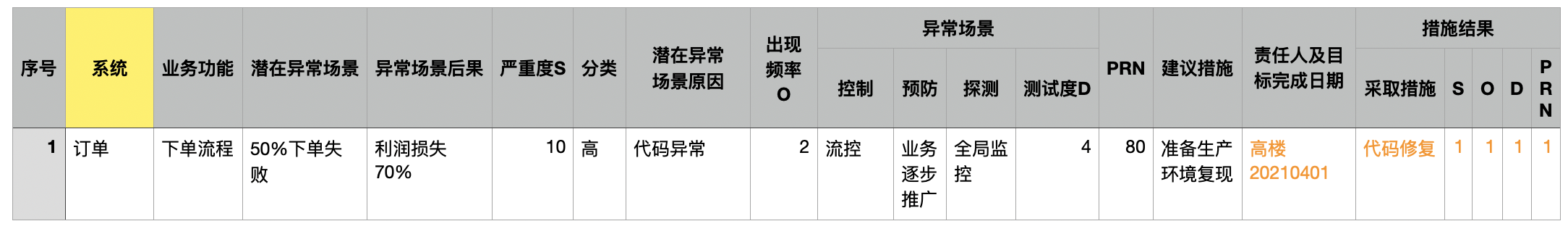 我解释一下表格中的“RPN”,它是Risk Priority Number的缩写,意思是风险系数、风险优先级。RPN是“严重度 S”、“频度 O”、“探测度 D”三个的乘积。至于表格中其他的名词,你看了字就能大概理解,我在这里就不多啰嗦了。