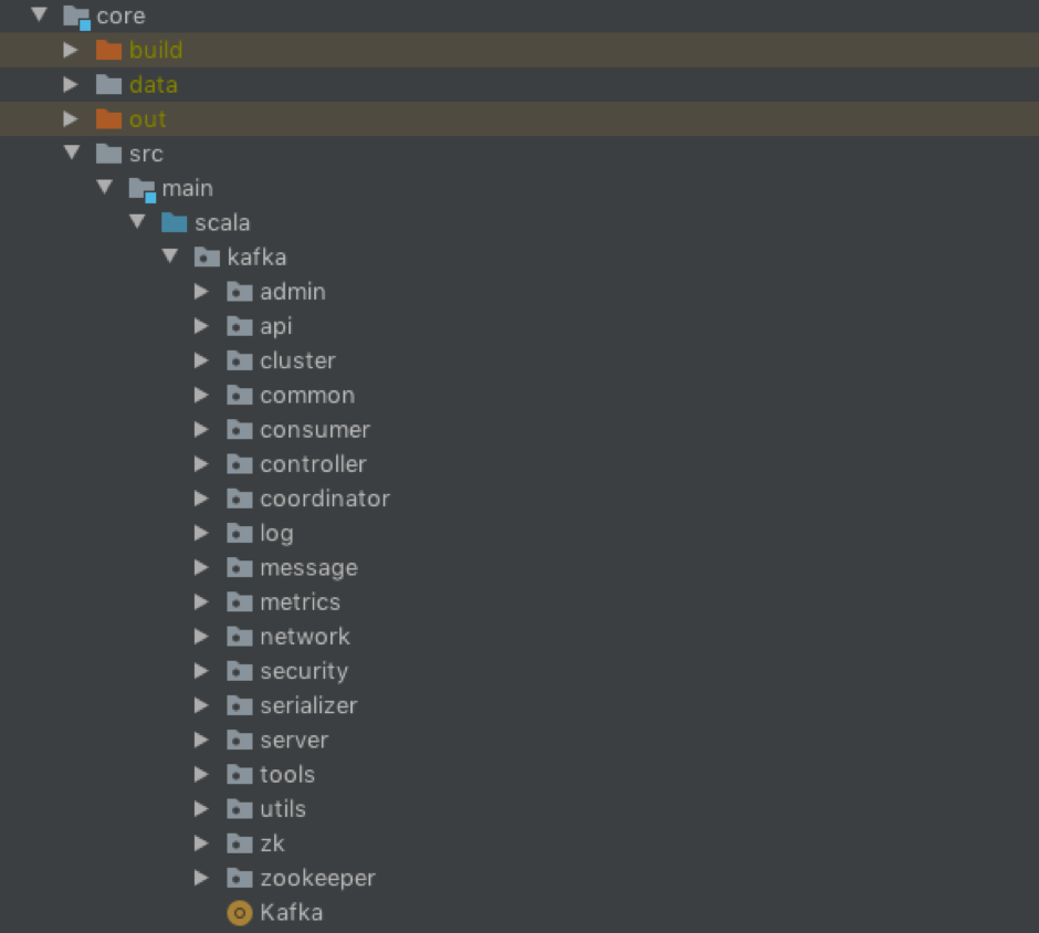 - core目录:保存Broker端代码。Kafka服务器端代码全部保存在该目录下。