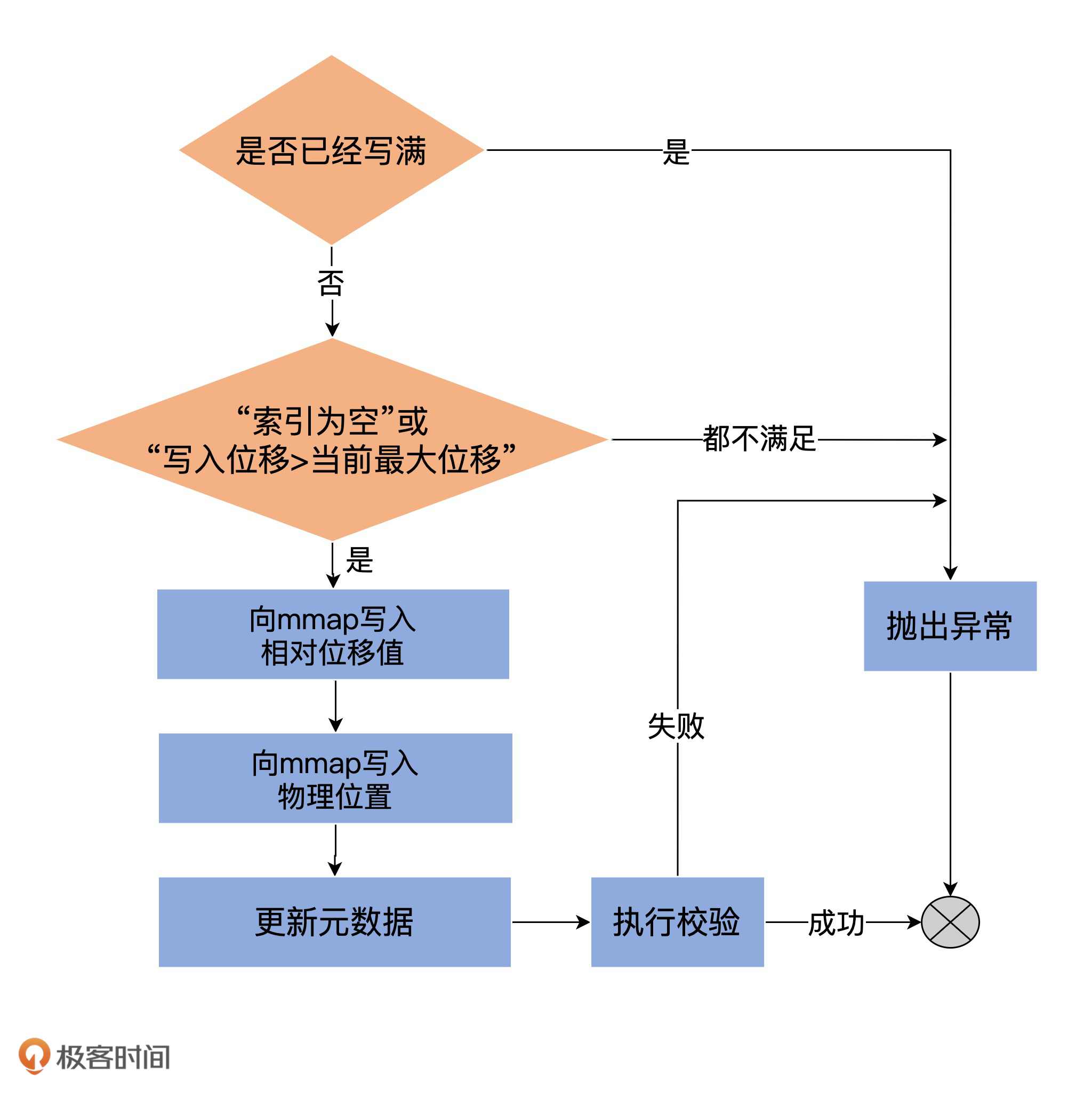 下面这段代码是OffsetIndex的append方法,用于向索引文件中写入新索引项。