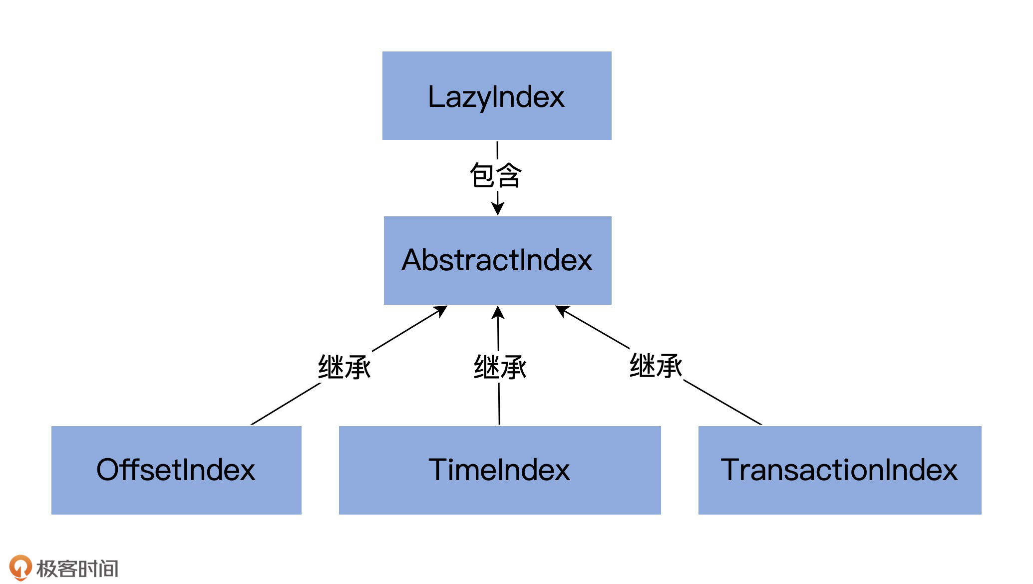 其中,OffsetIndex、TimeIndex和TransactionIndex都继承了AbstractIndex类,而上层的LazyIndex仅仅是包装了一个AbstractIndex的实现类,用于延迟加载。就像我之前说的,LazyIndex的作用是为了提升性能,并没有什么功能上的改进。