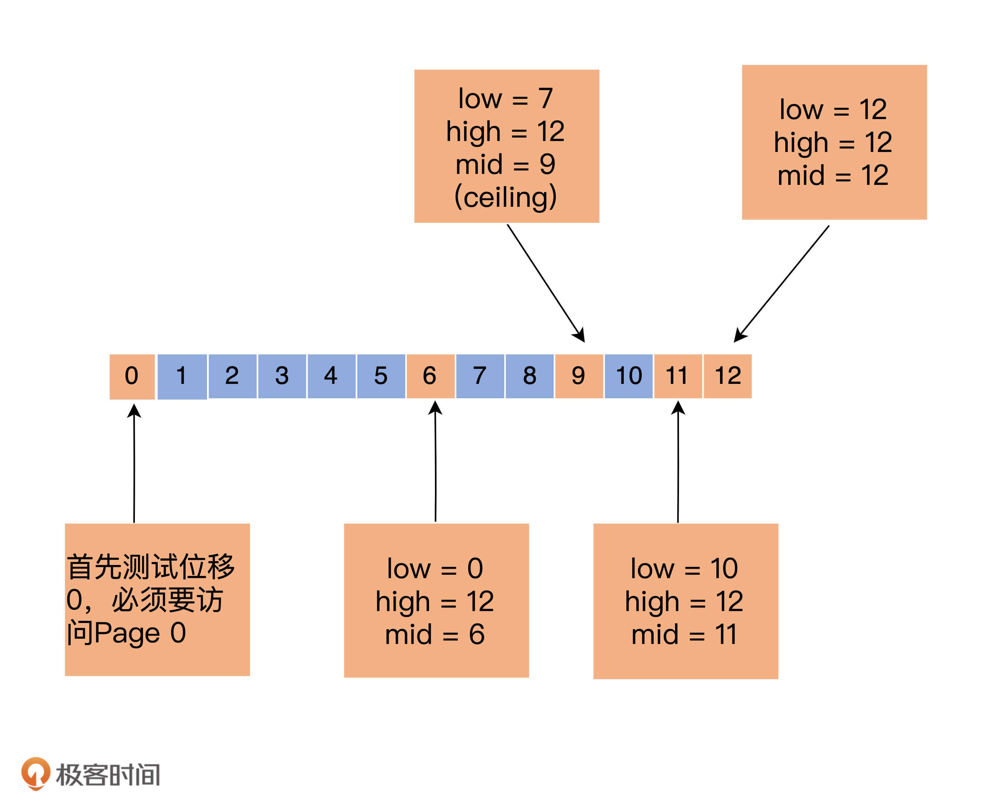 下面我举个例子来说明一下这个情况。假设Kafka的某个索引占用了操作系统页缓存13个页(Page),如果待查找的位移值位于最后一个页上,也就是Page 12,那么标准的二分查找算法会依次读取页号0、6、9、11和12,具体的推演流程如下所示: