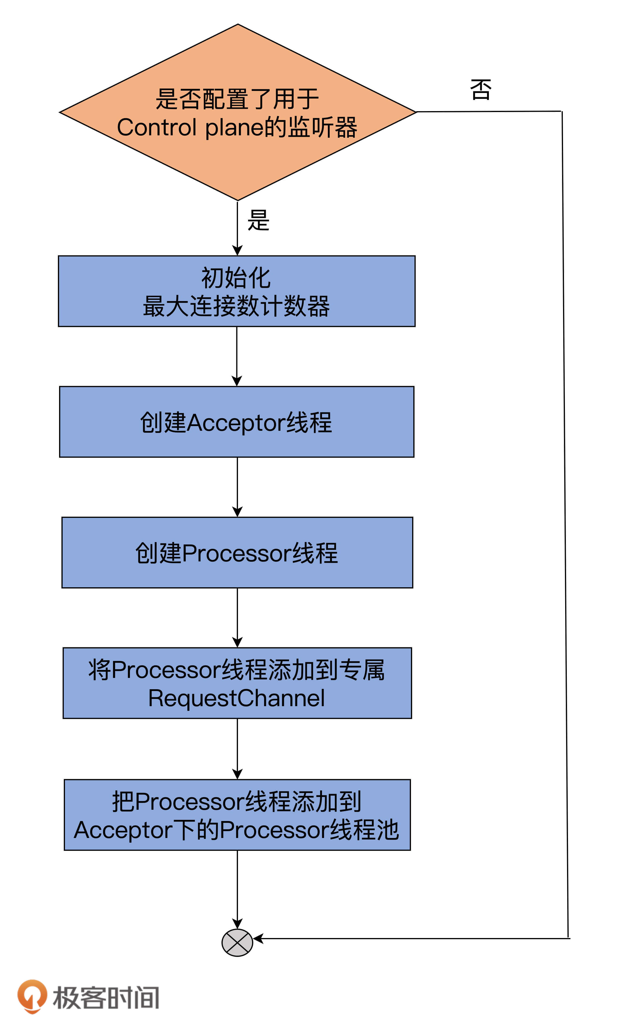 总体流程和createDataPlaneAcceptorsAndProcessors非常类似,只是方法开头需要判断是否配置了用于Control plane的监听器。目前,Kafka规定只能有1套监听器用于Control plane,而不能像Data plane那样可以配置多套监听器。