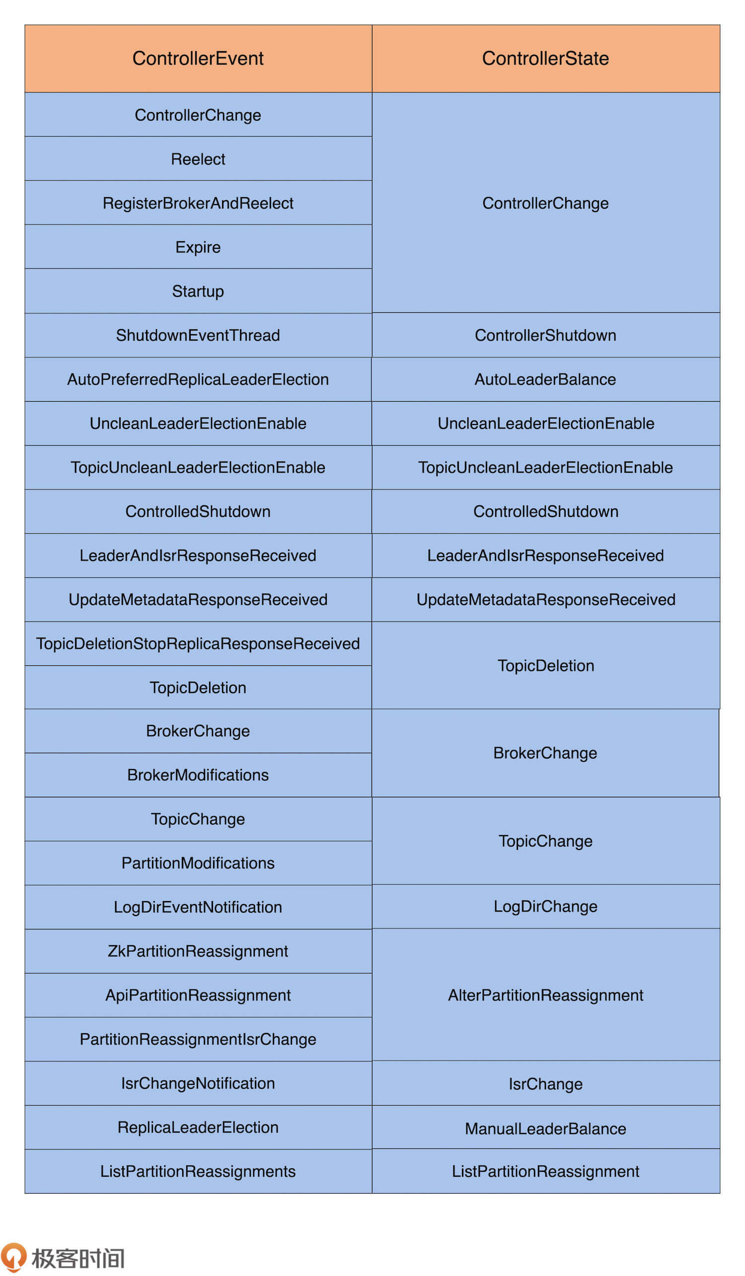 - ControllerState:定义Controller状态。你可以认为,它是ControllerEvent的上一级分类,因此,ControllerEvent和ControllerState是多对一的关系。