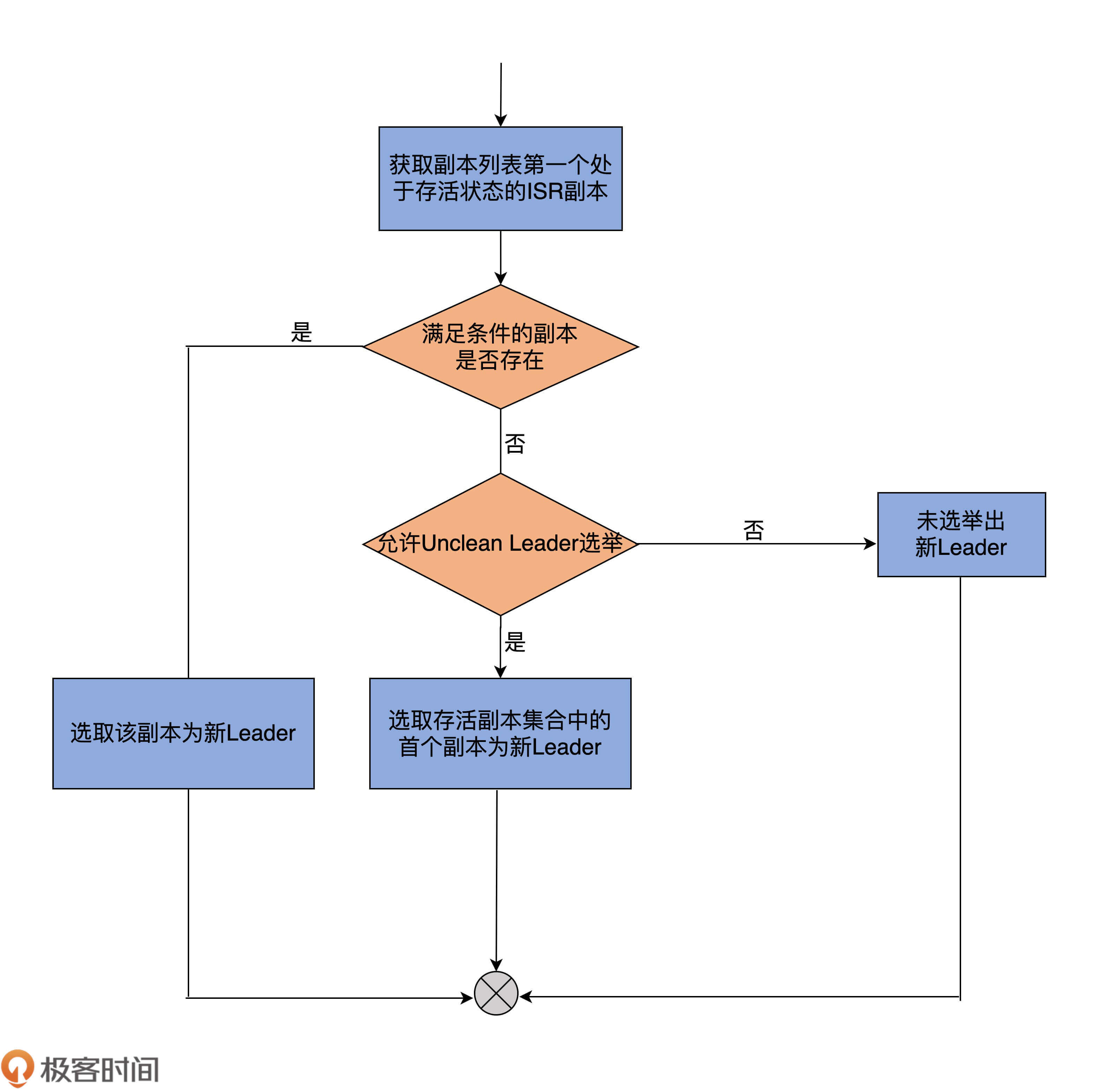 前面说过了,这4种不同的策略定义了4个专属的方法来进行Leader选举。其实,如果你打开这些方法的源码,就会发现它们大同小异。基本上,选择Leader的规则,就是选择副本集合中首个存活且处于ISR中的副本作为Leader。