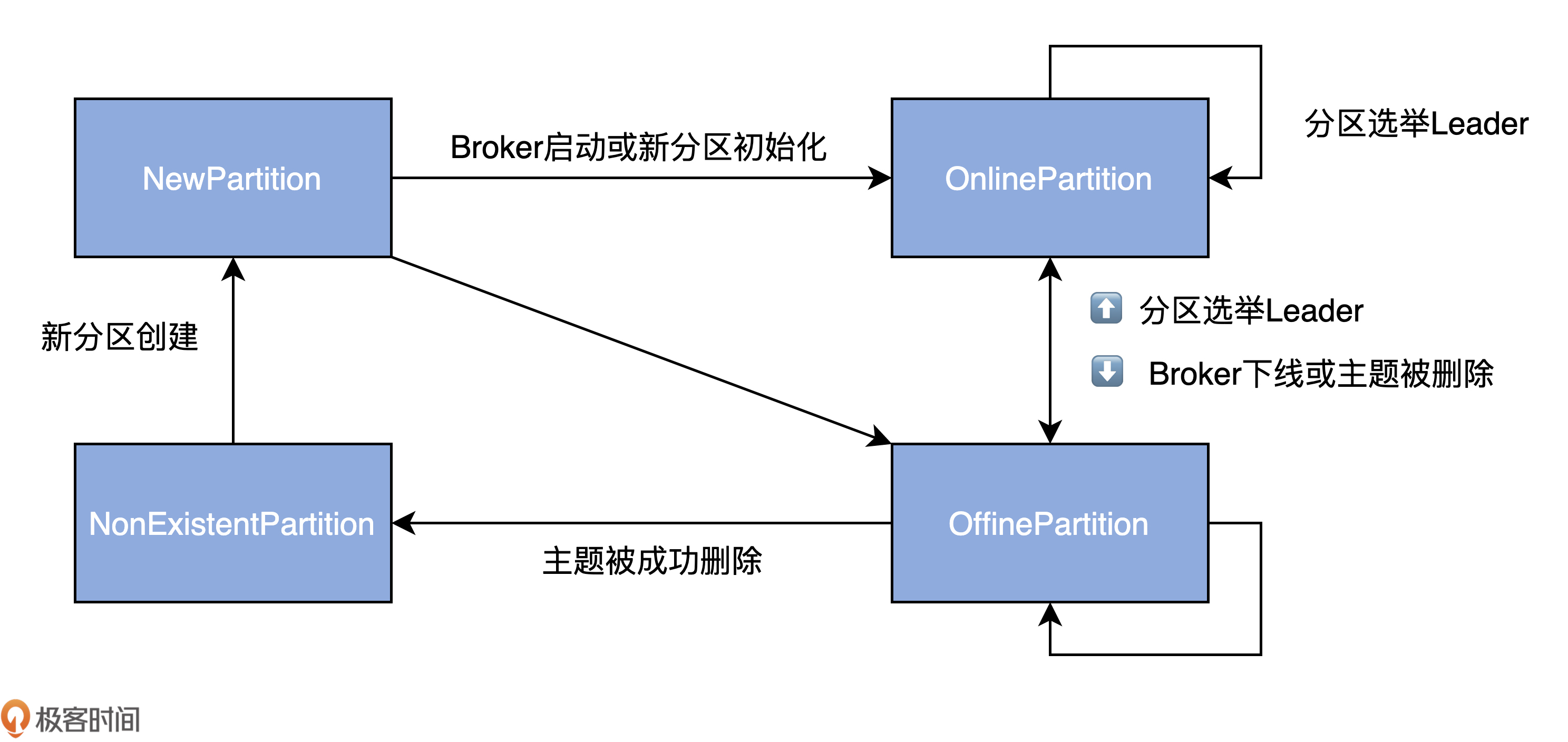 - PartitionState接口及其实现对象:定义4类分区状态,分别是NewPartition、OnlinePartition、OfflinePartition和NonExistentPartition。除此之外,还定义了它们之间的流转关系。