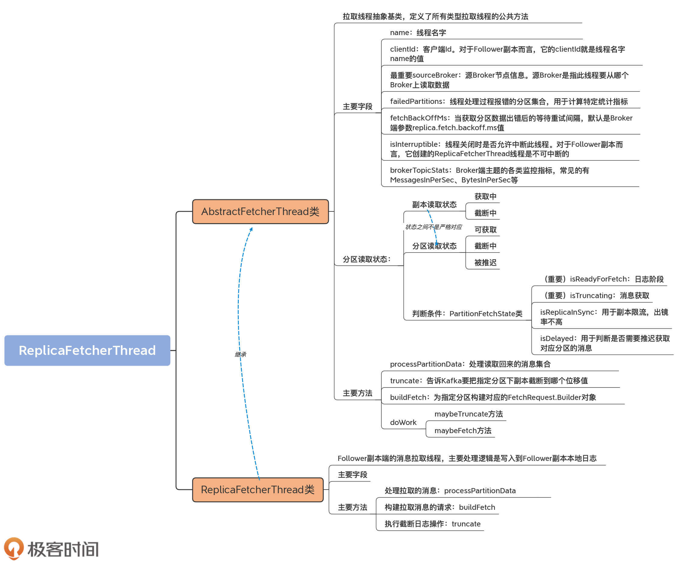 好了,我们说回Follower副本从Leader副本拉取数据这件事儿。不知道你有没有注意到,我在前面的例子提到了一个名字:ReplicaFetcherThread,也就是副本获取线程。没错,Kafka源码就是通过这个线程实现的消息拉取及处理。