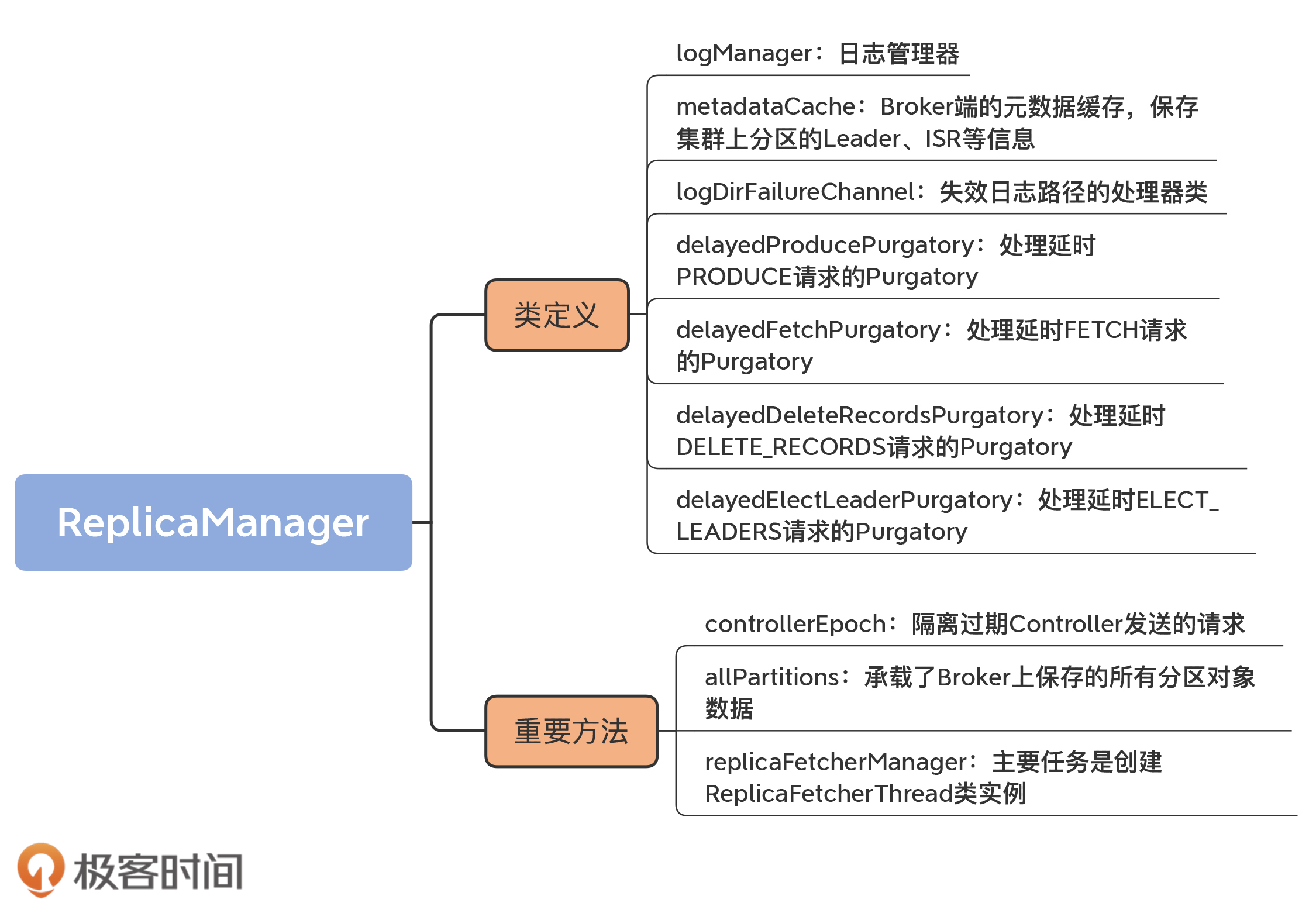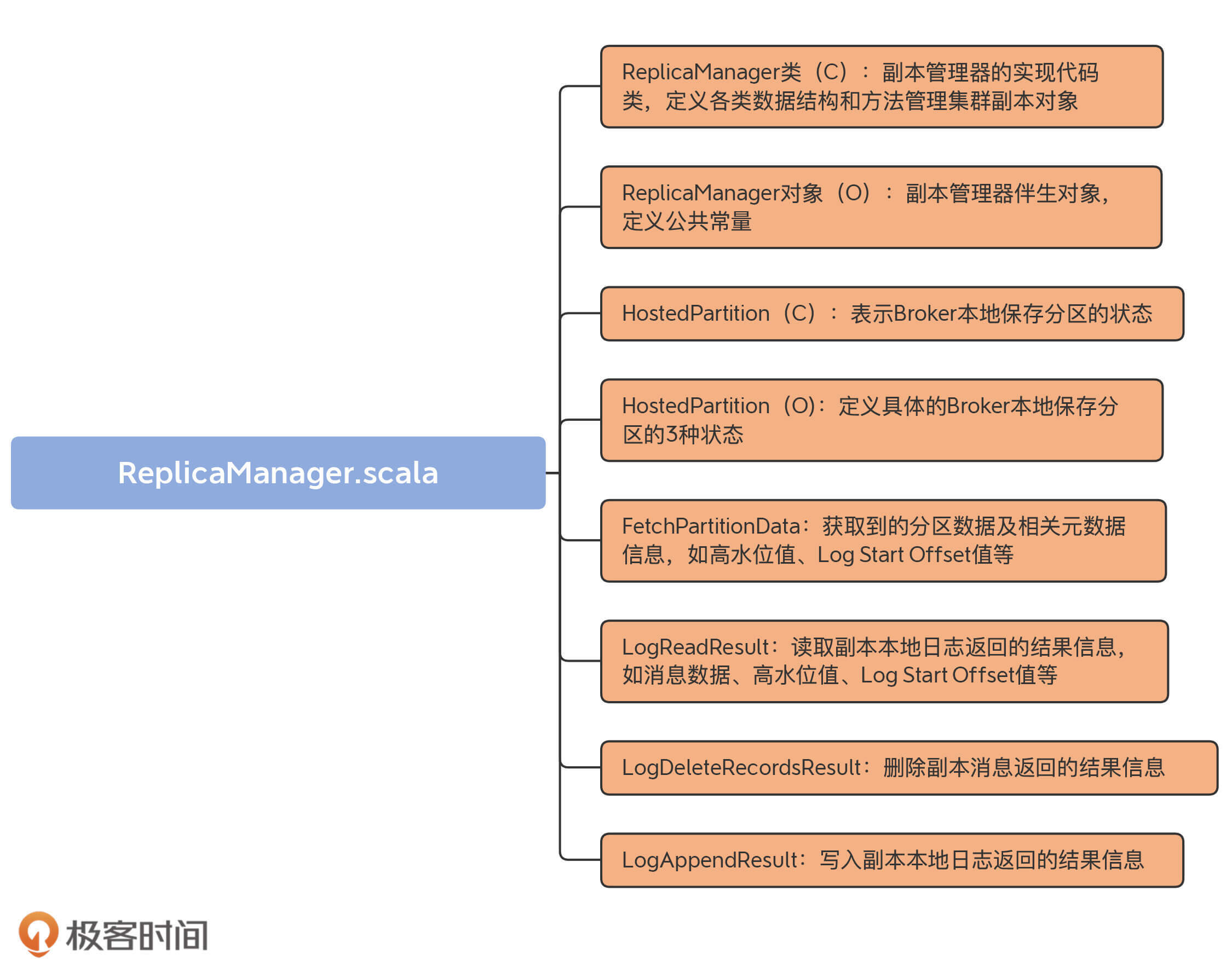 因为副本的读写操作和管理操作都是重磅功能,所以,在深入细节之前,我们必须要理清ReplicaManager类的结构之间的关系,并且搞懂类定义及核心字段,这就是我们这节课的重要目标。