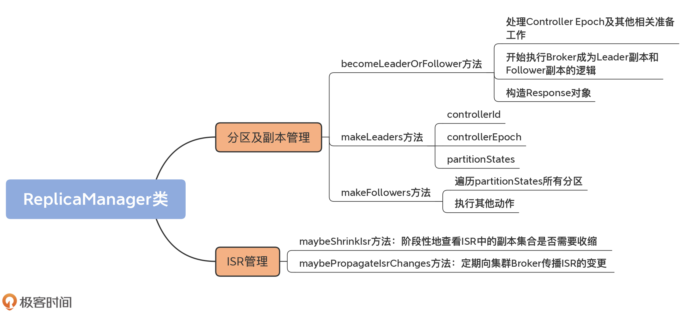 今天,我们重点学习了ReplicaManager类的分区和副本管理功能,以及ISR管理。我们再完整地梳理下ReplicaManager类的核心功能和方法。