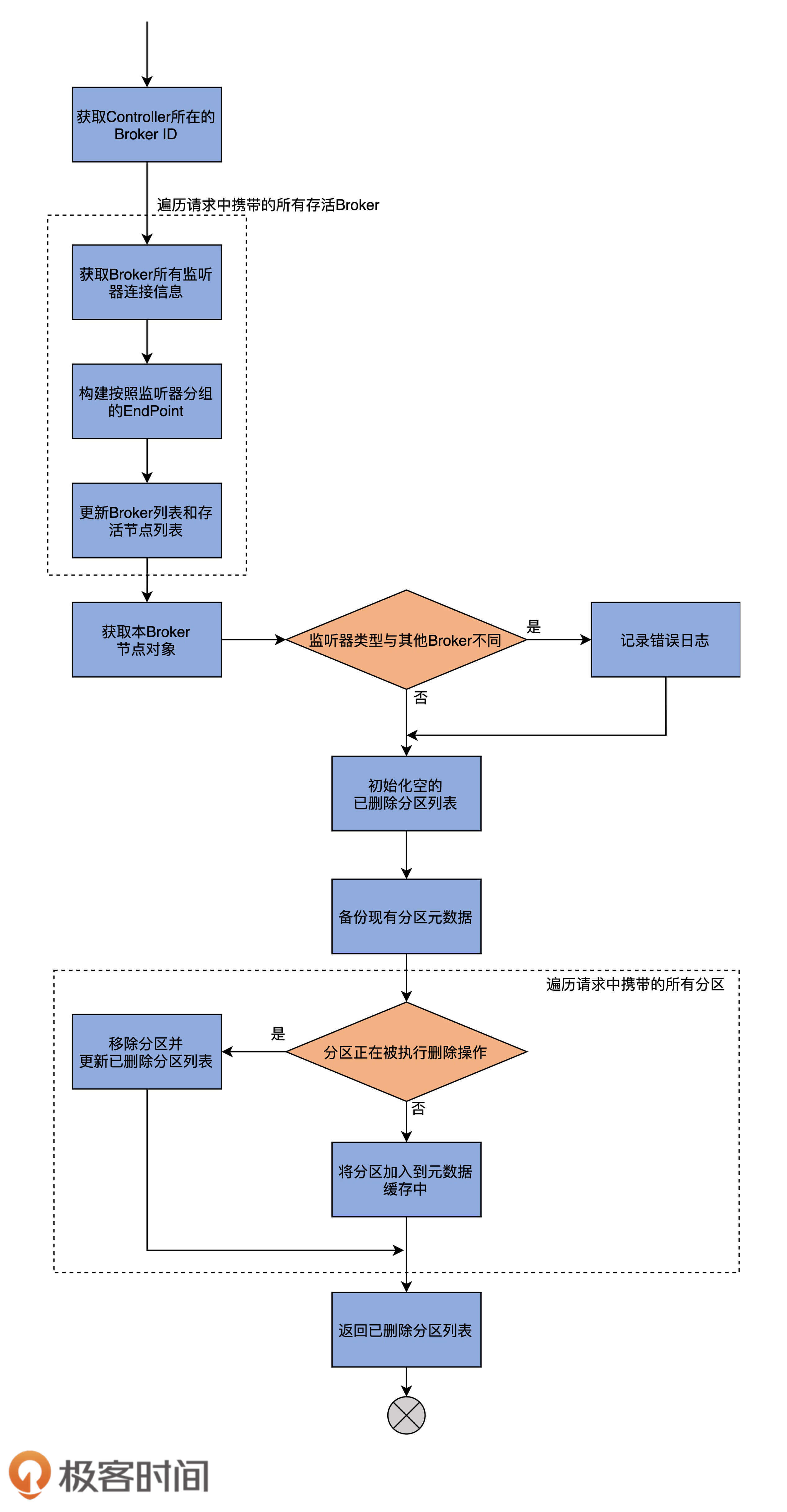 之后,获取UpdateMetadataRequest请求中携带的所有分区数据,并遍历每个分区数据。如果发现分区处于被删除的过程中,就将分区从元数据缓存中移除,并把分区加入到已删除分区数组中。否则的话,代码就将分区加入到元数据缓存中。