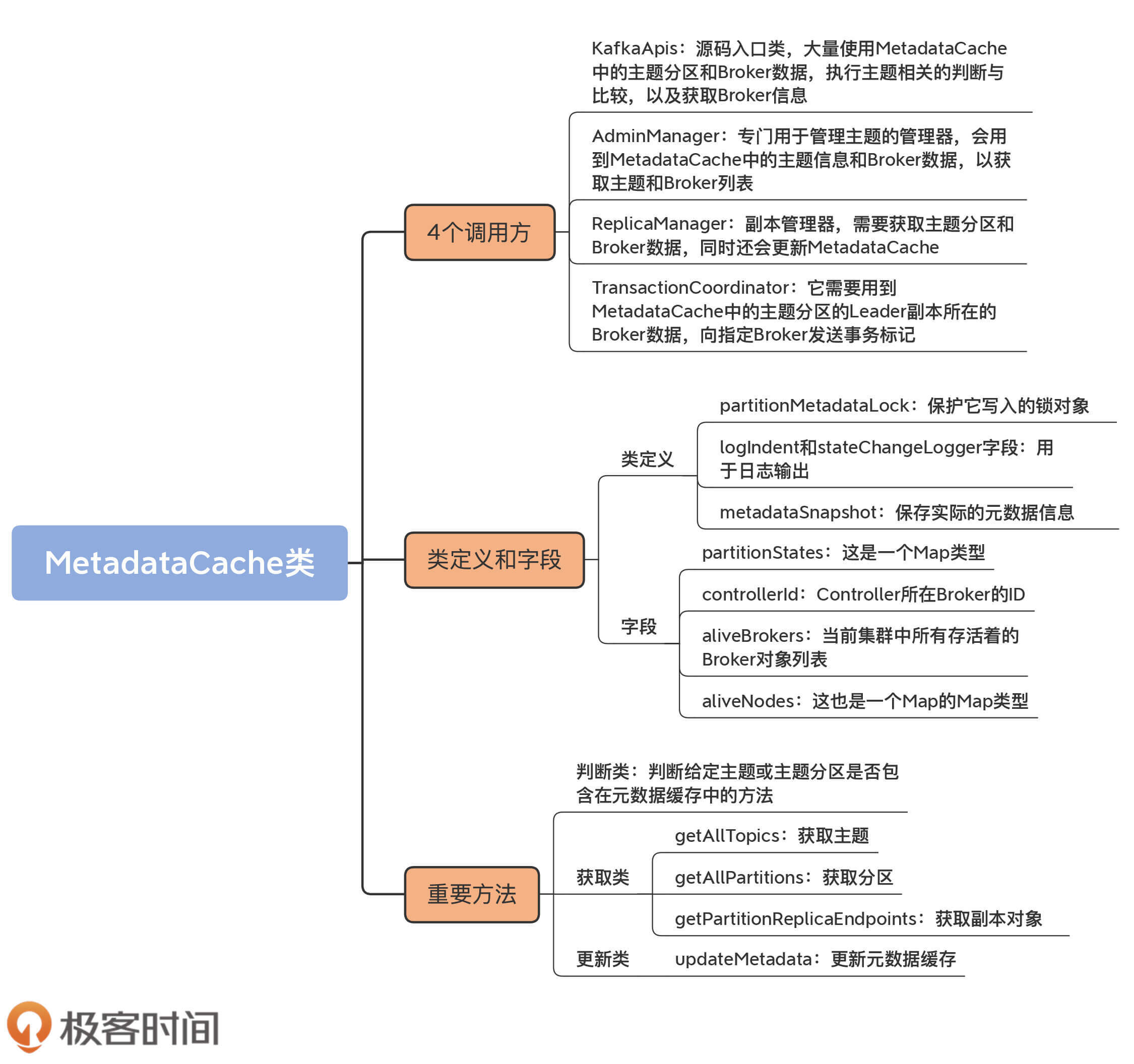 搞清楚了MetadataCache类被创建的时机以及它的调用方,我们就了解了它的典型使用场景,即作为集群元数据集散地,它保存了集群中关于主题和Broker的所有重要数据。那么,接下来,我们来看下这些数据到底都是什么。