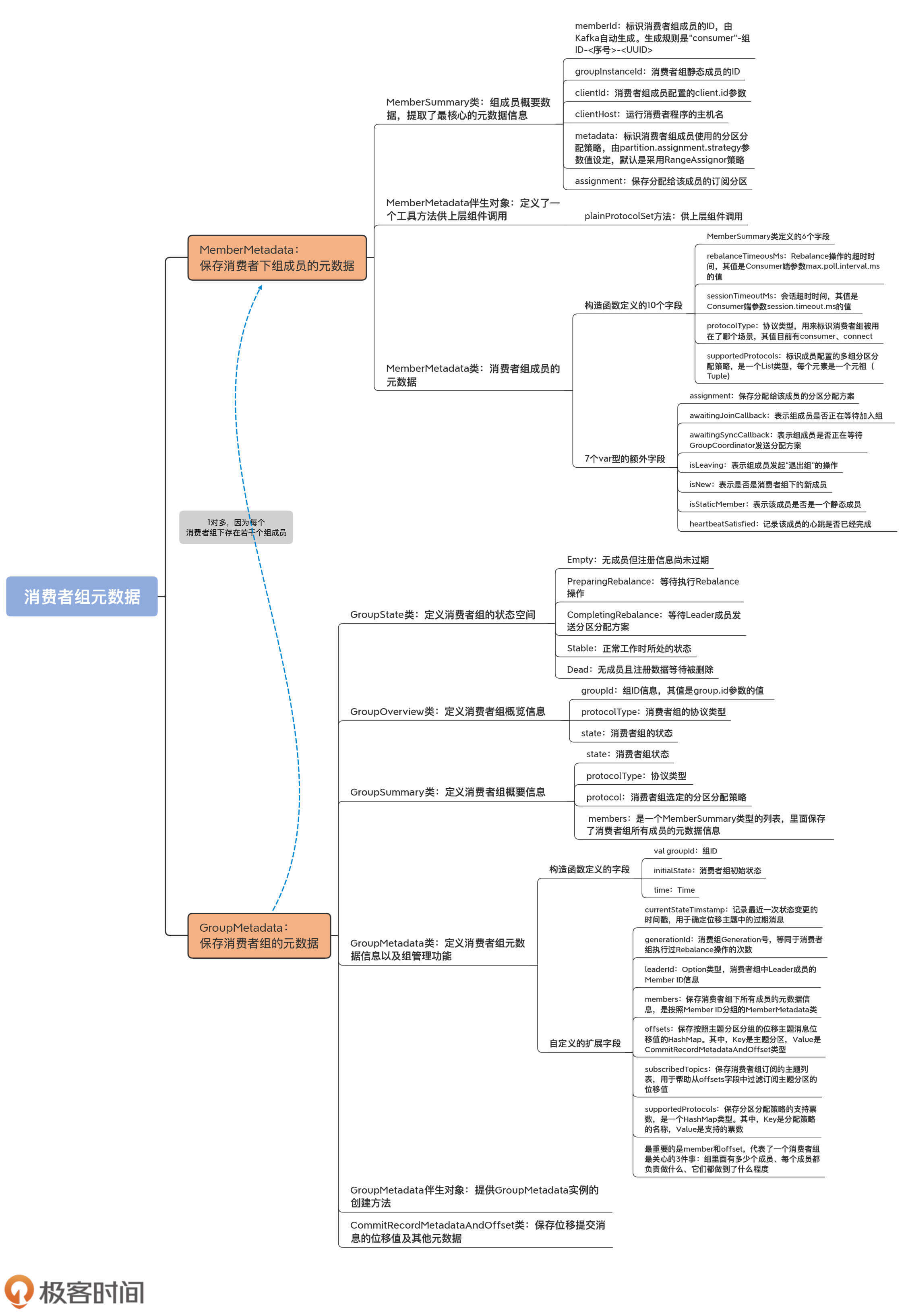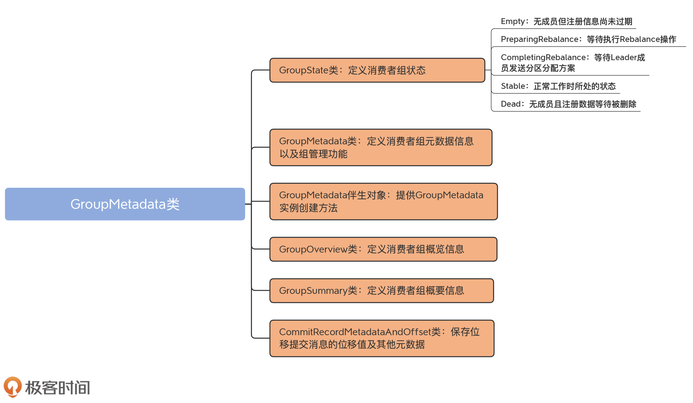 GroupMetadata管理的是消费者组而不是消费者组成员级别的元数据,所以,它的代码结构要比MemberMetadata类复杂得多。我先画一张思维导图帮你梳理下它的代码结构。