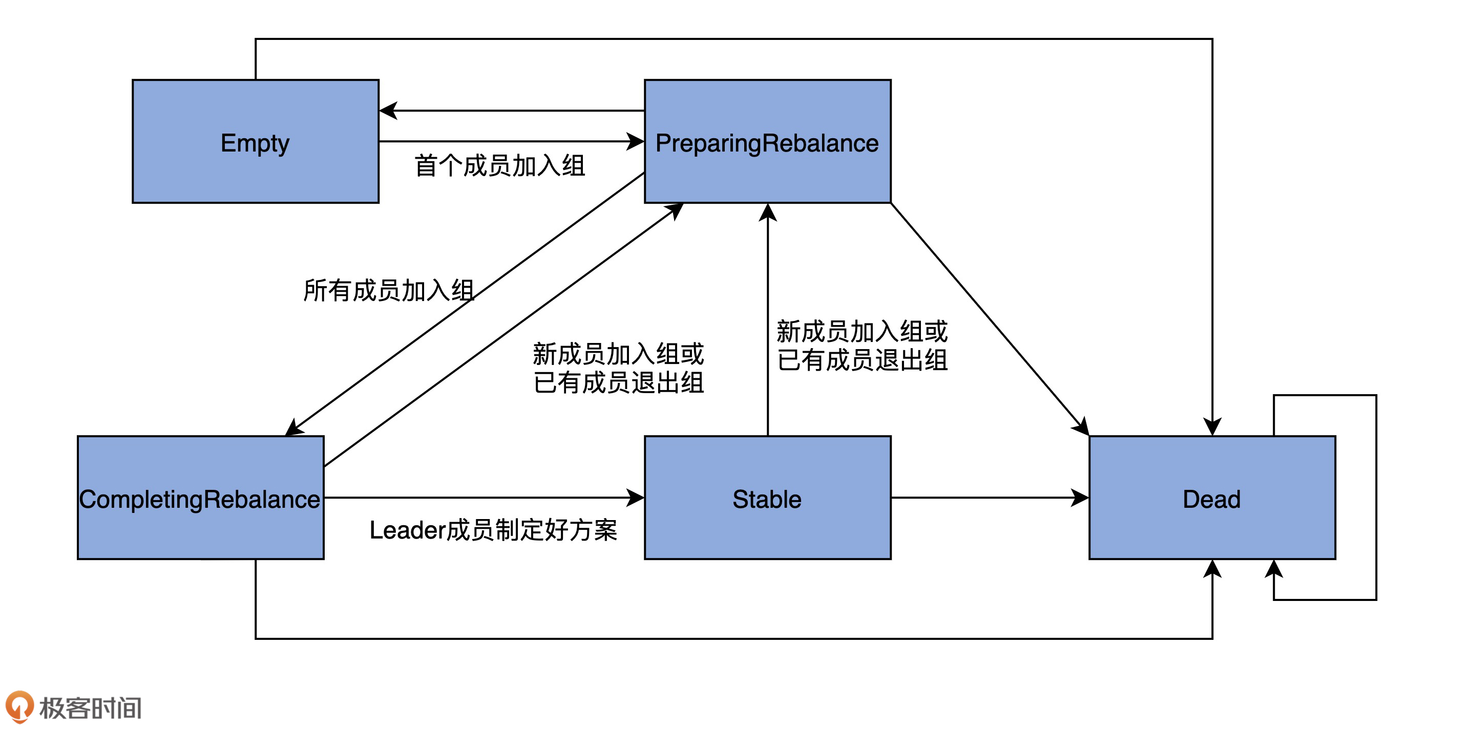 你需要记住的是,一个消费者组从创建到正常工作,它的状态流转路径是Empty -> PreparingRebalance -> CompletingRebalance -> Stable。