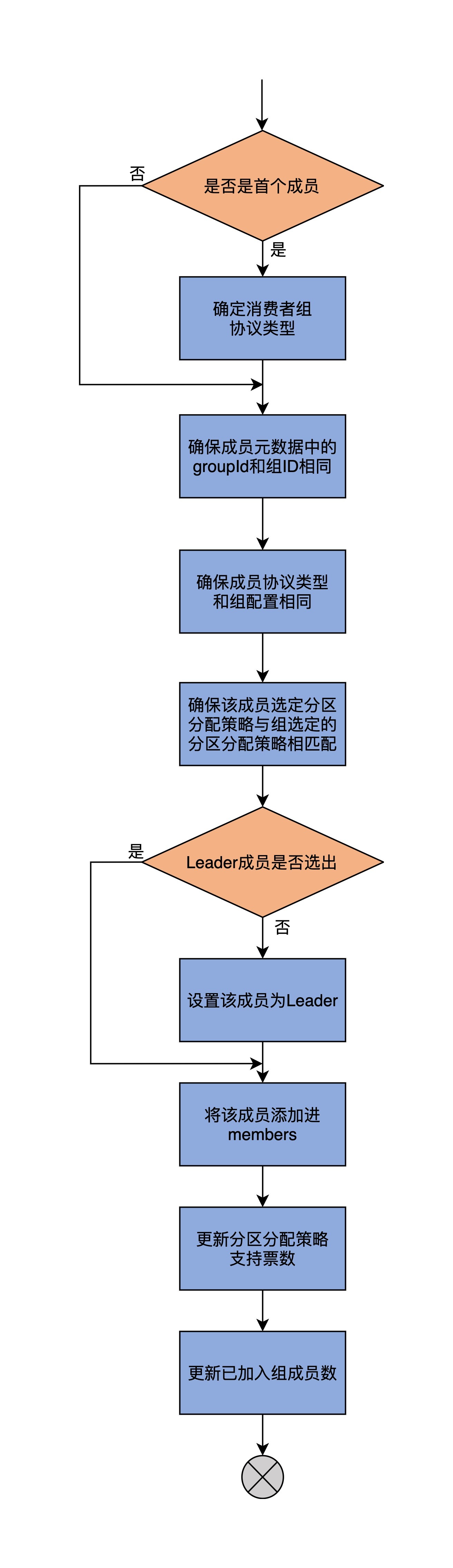 第二步,add方法会连续进行三次校验,分别确保待添加成员的组ID、protocolType和组配置一致,以及该成员选定的分区分配策略与组选定的分区分配策略相匹配。如果这些校验有任何一个未通过,就会立即抛出异常。