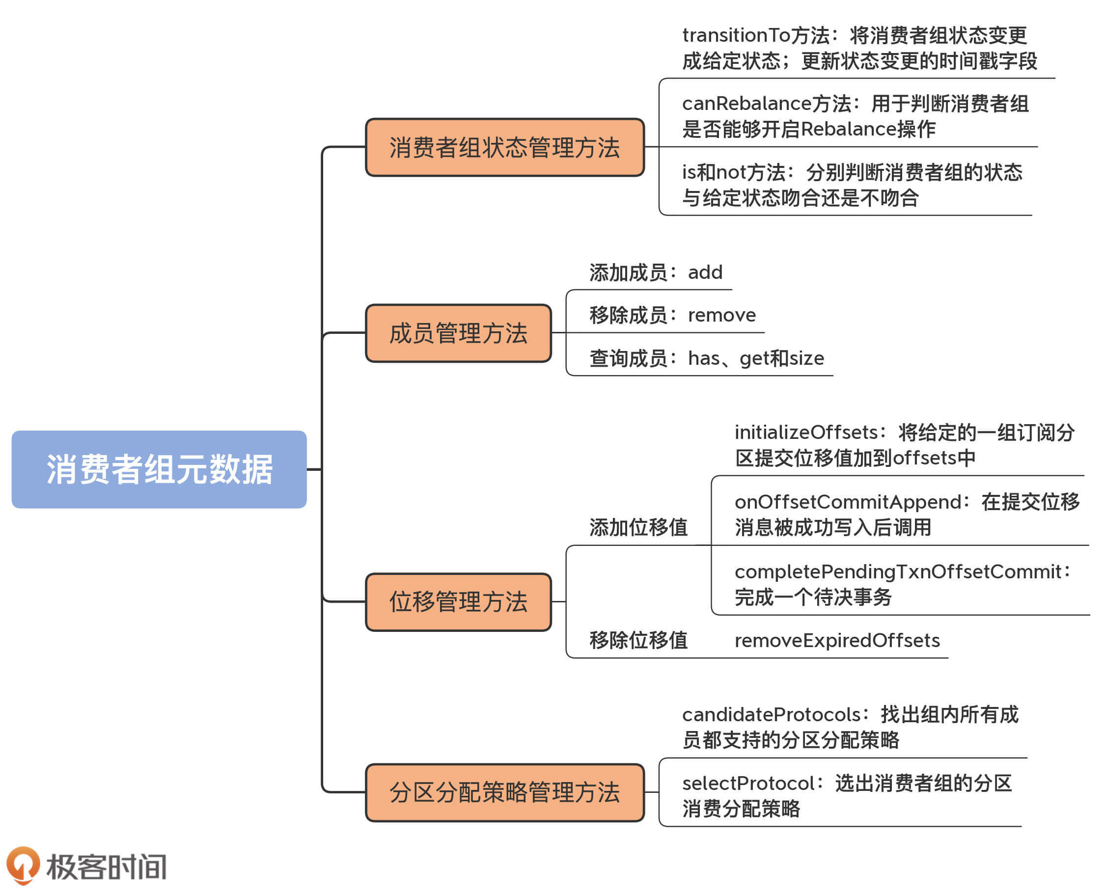 消费者组状态是很重要的一类元数据。管理状态的方法,要做的事情也就是设置和查询。这些方法大多比较简单,所以我把它们汇总在一起,直接介绍给你。