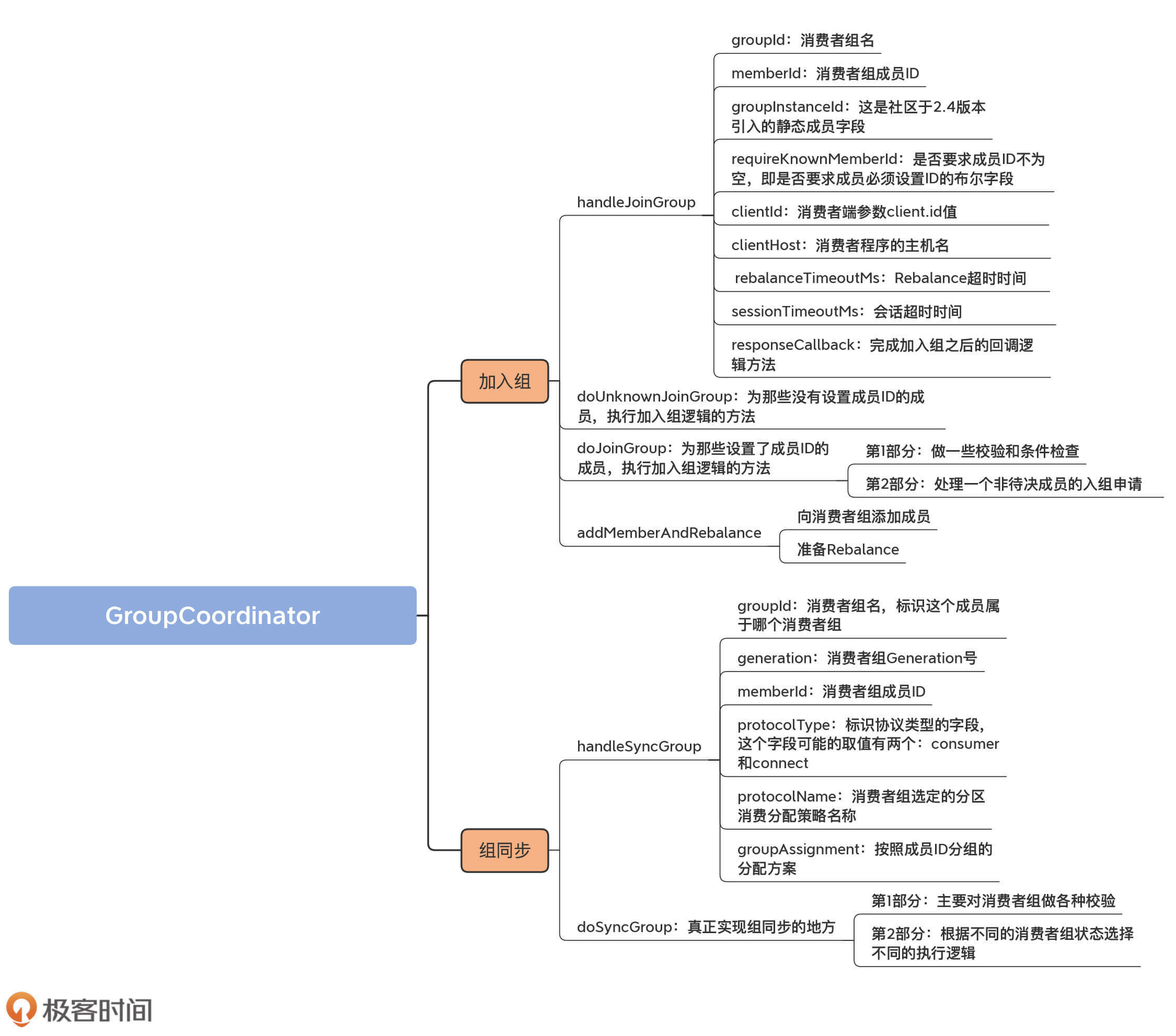 接下来,我们就来具体学习下组同步流程的实现逻辑。我们先从顶层的入口方法handleSyncGroup方法开始学习,该方法被KafkaApis类的handleSyncGroupRequest方法调用,用于处理消费者组成员发送的SyncGroupRequest请求。顺着这个入口方法,我们会不断深入,下沉到具体实现组同步逻辑的私有化方法doSyncGroup。