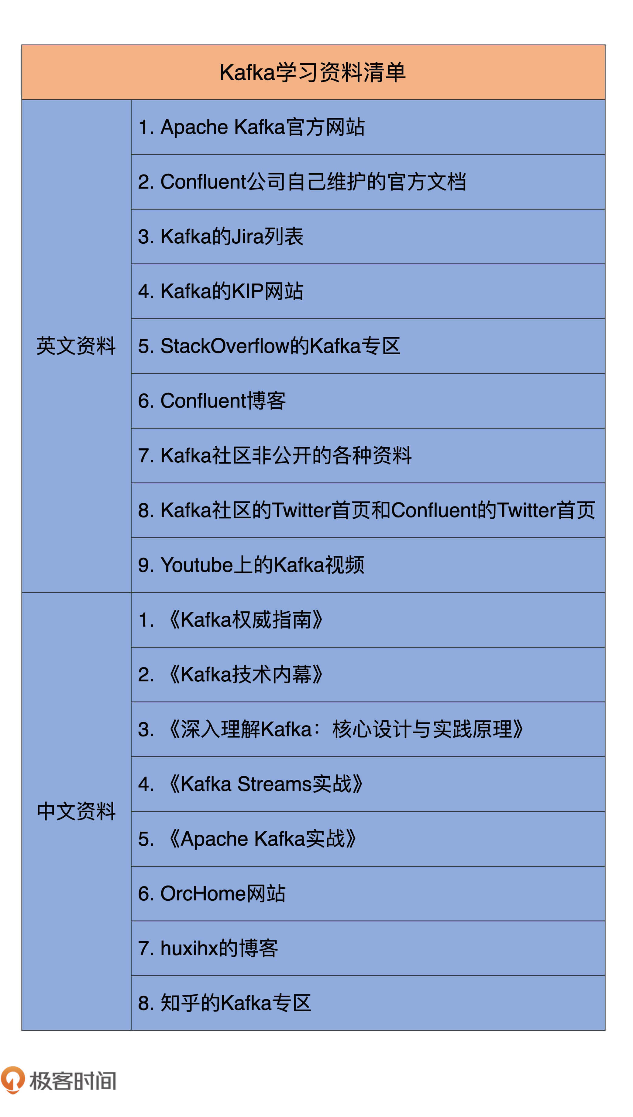 好了,上面的这些内容就是我总结的Kafka学习资料清单,希望它们对你是有帮助的。我把它们整理在了一张表格里,你可以重点看下。