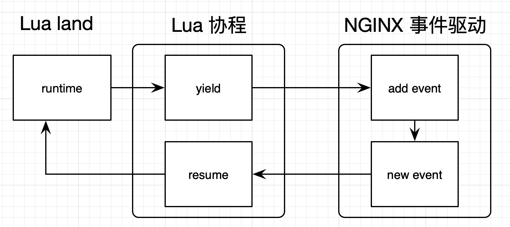遇到网络 I/O 时,它会交出控制权(yield),把网络事件注册到 Nginx 监听列表中,并把权限交给 Nginx;当有 Nginx 事件达到触发条件时,便唤醒对应的协程继续处理(resume)。
