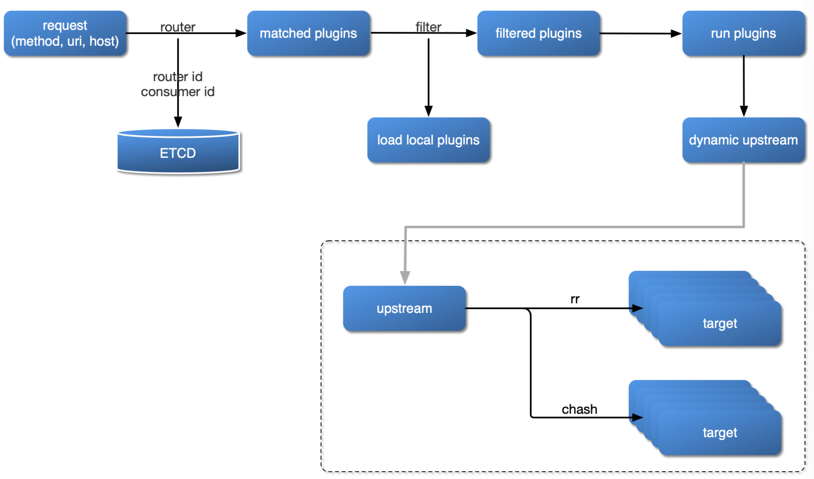 - 首先,会根据请求的方法、uri、host、请求头等条件,去路由规则中进行匹配。如果命中了某条路由规则,就会从 etcd 中获取对应的插件列表。