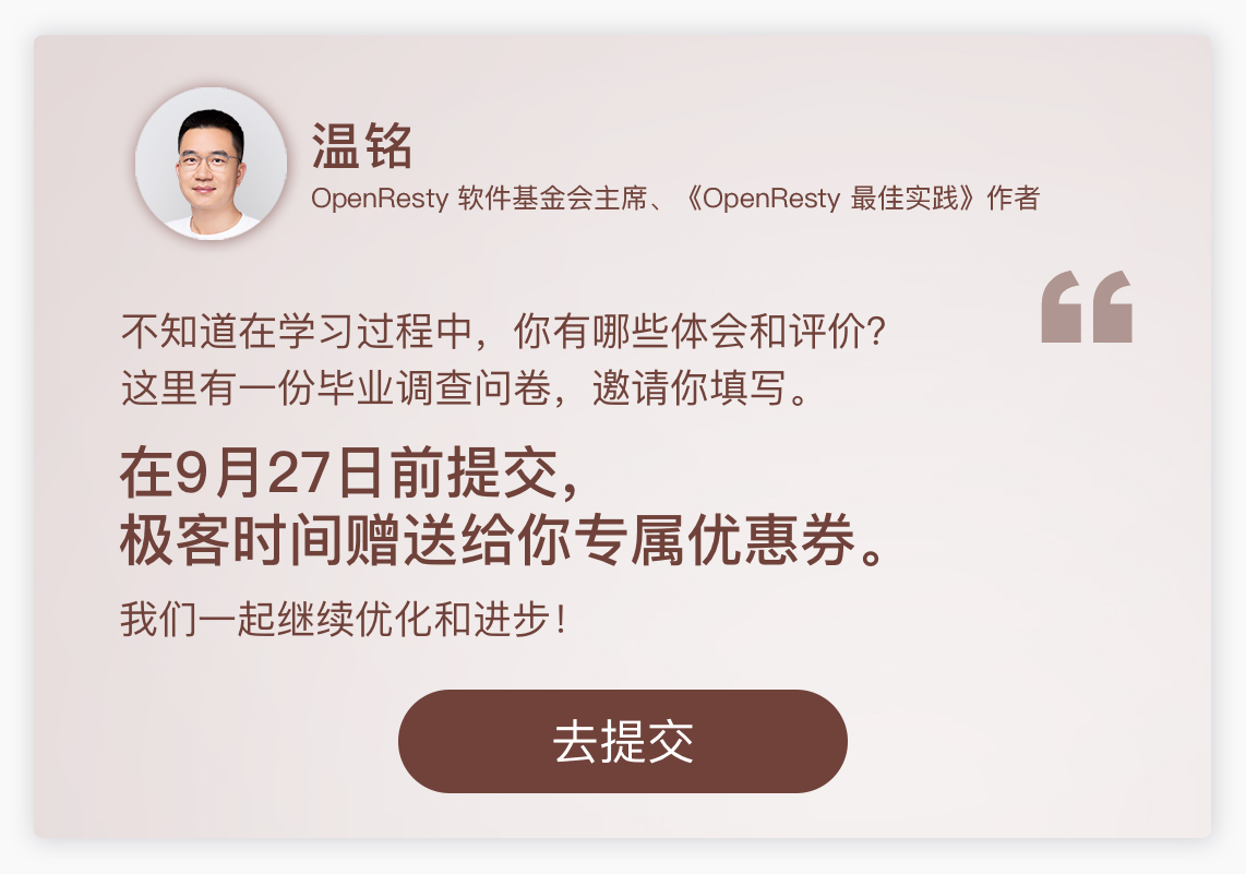 另外,我们专栏的编辑同学,特意为你准备了一份结课调查问卷,希望你能抽出两三分钟时间填问卷,写下你的学习经历和感受。这既是学习一门课程的仪式感,可以作为你这几个月学习的记录和总结;也是我后续为你迭代优化课程的重要参考资料,很有价值。我很希望能听到你的声音。