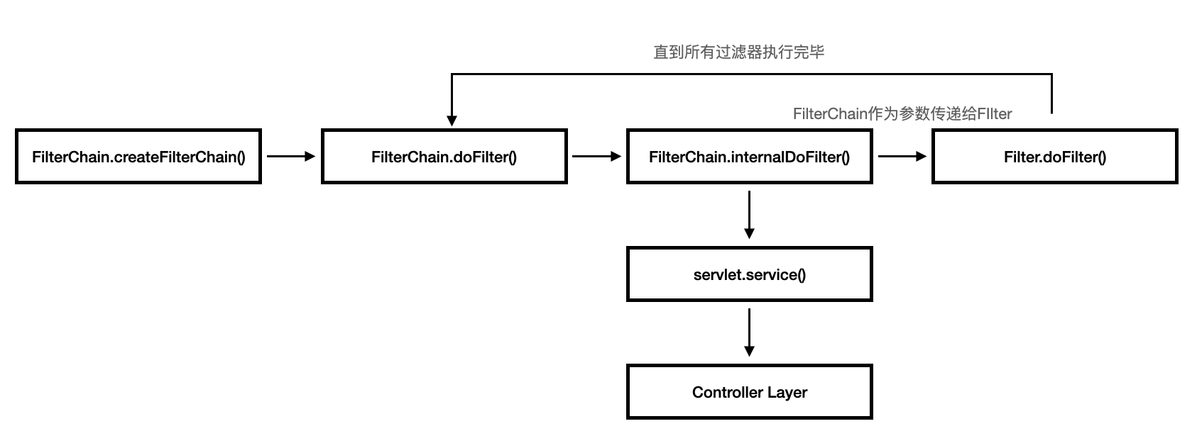 - 此时会循环执行进入第 2 步、第 3 步、第 4 步,直到第3步中所有的 Filter 类都被执行完毕为止;