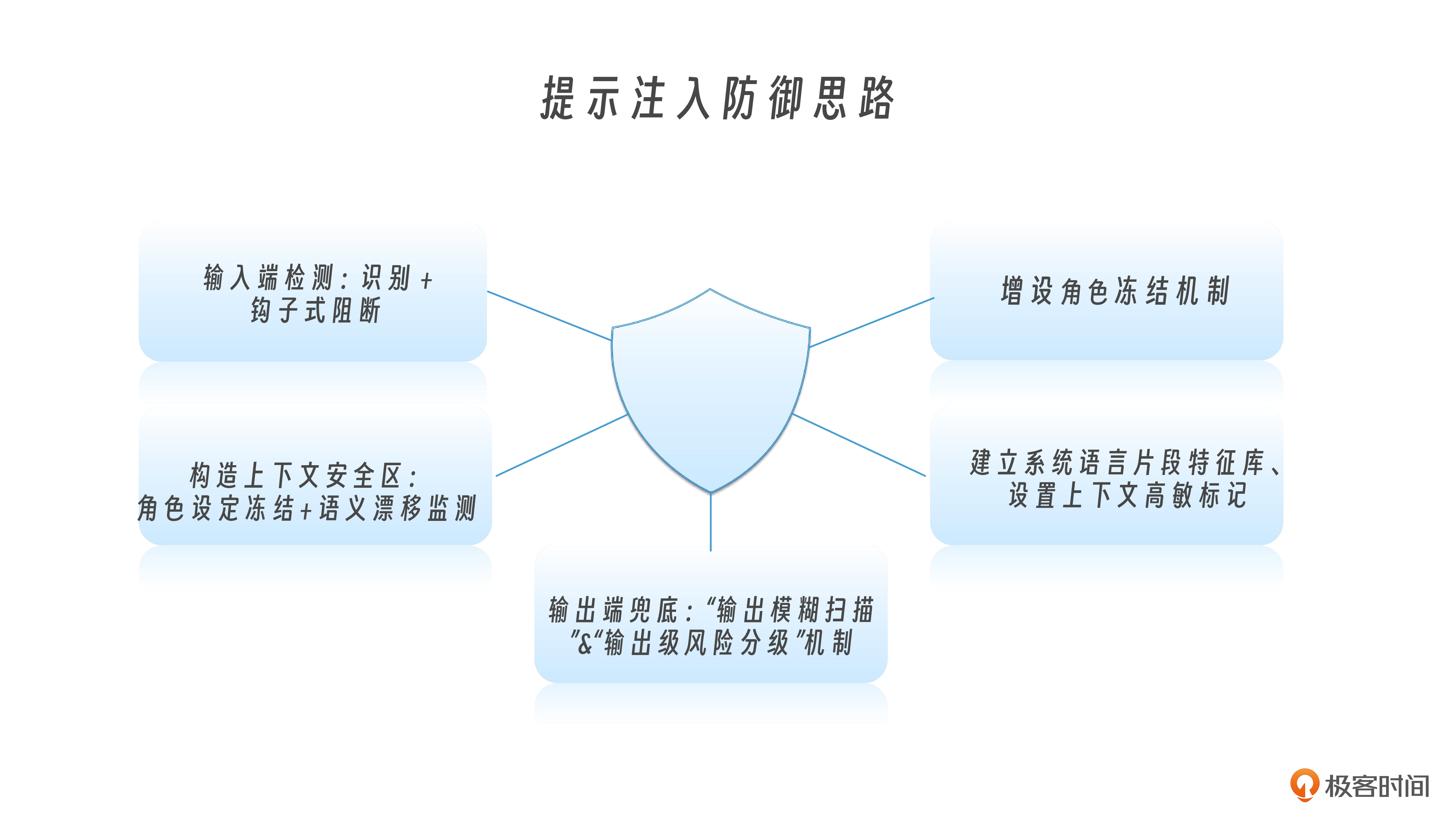 那这节课,我们就要正式还手了。你可以把这节课当作一场反击演练:我们不再讨论攻击者怎么打,而是讲平台方怎么防。防的手段不只在训练阶段,也不只靠关键词过滤,而是要在输入、上下文、输出三个关键位置布下真正有效的“防御钉子”。我们先从输入端说起。