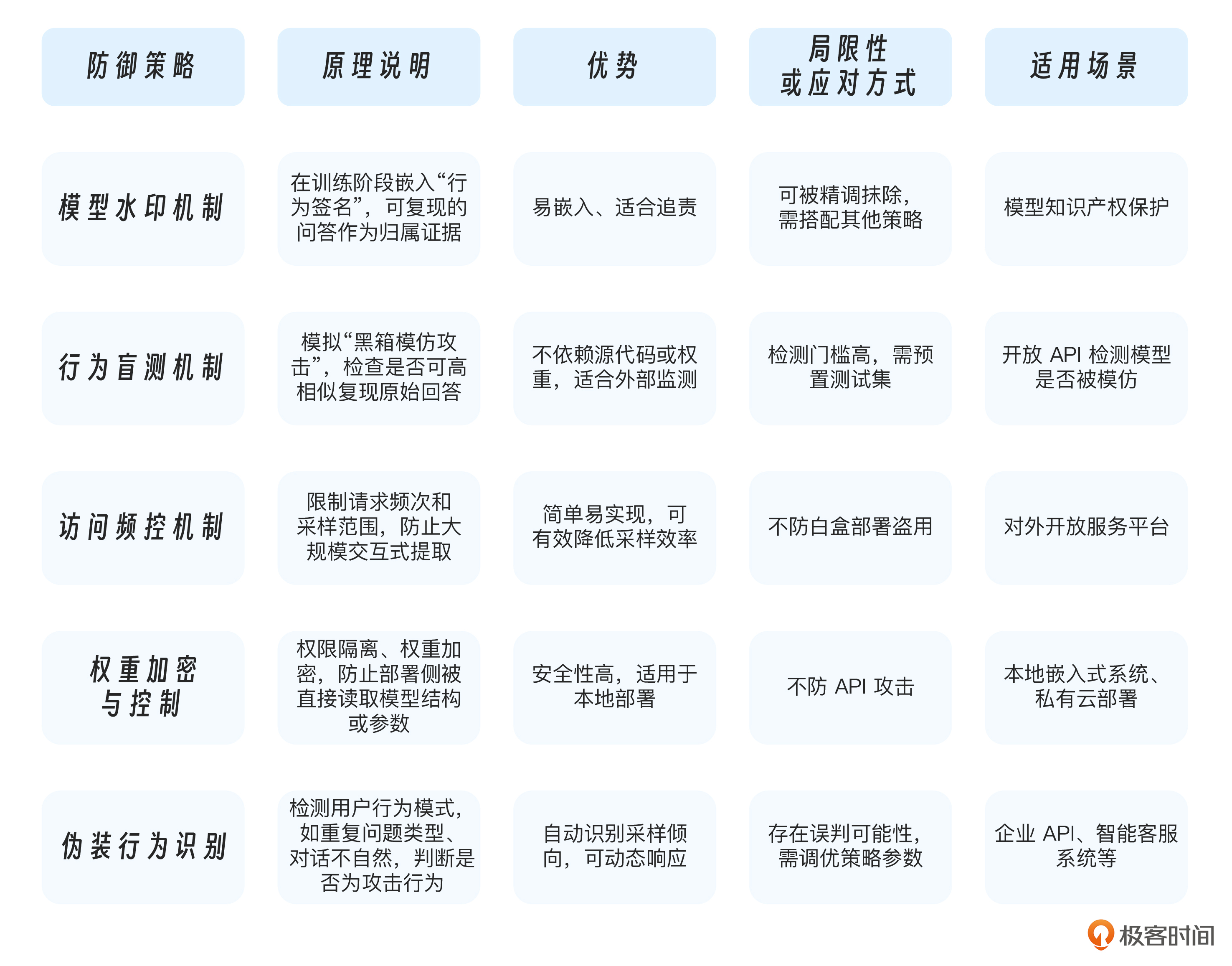 为了方便你更系统理解各种策略,我帮你主流的模型防盗方法做了如下总结。