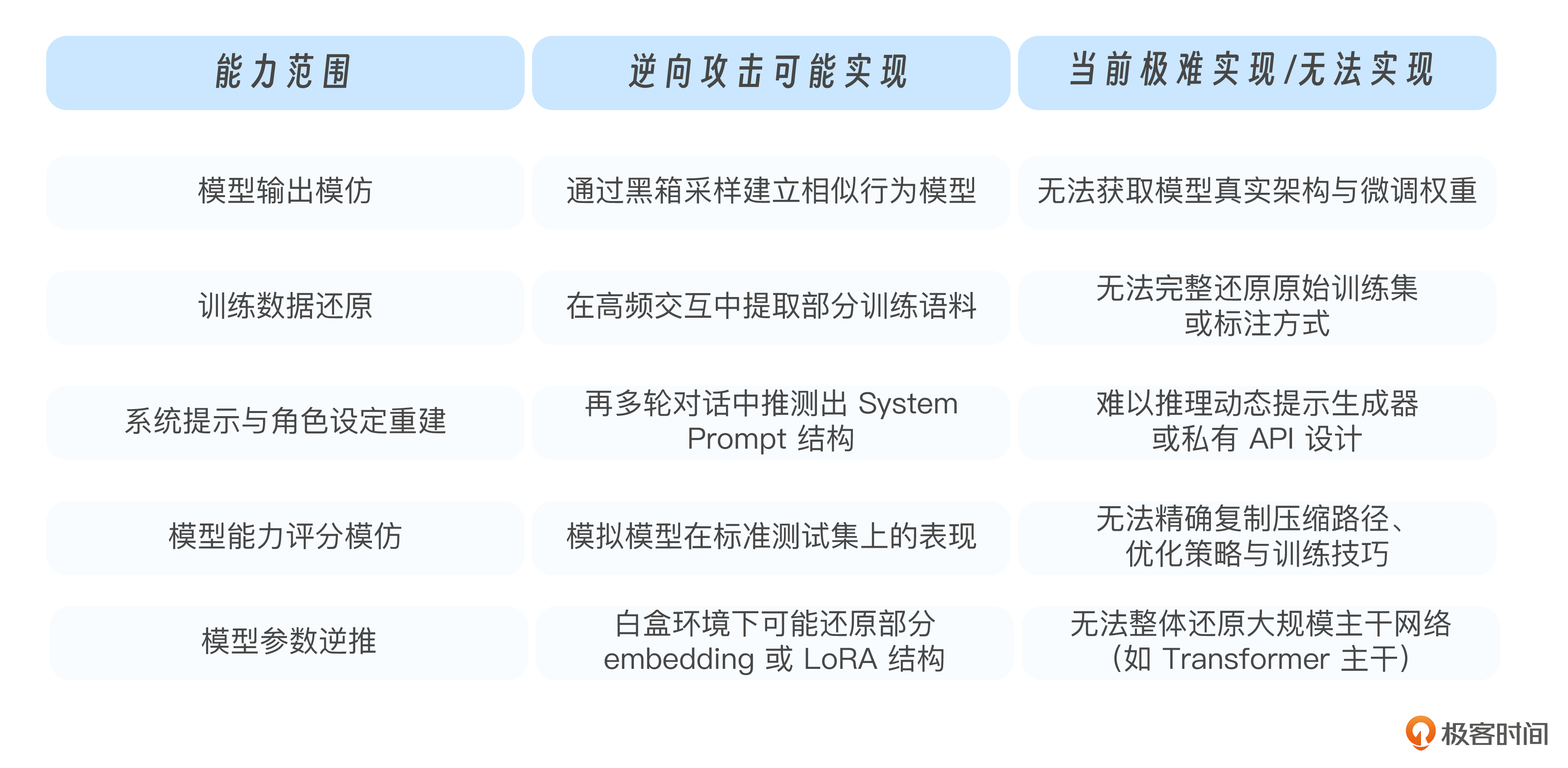 你有没有注意到到,它不像提示注入、后门投毒那样显眼,但可能让你数月的成果被山寨成“低成本竞争品”。为了帮你快速看清逆向攻击到底能做到什么、又做不到什么,理清这些攻击方式的能力边界,我整理了如下对照表。