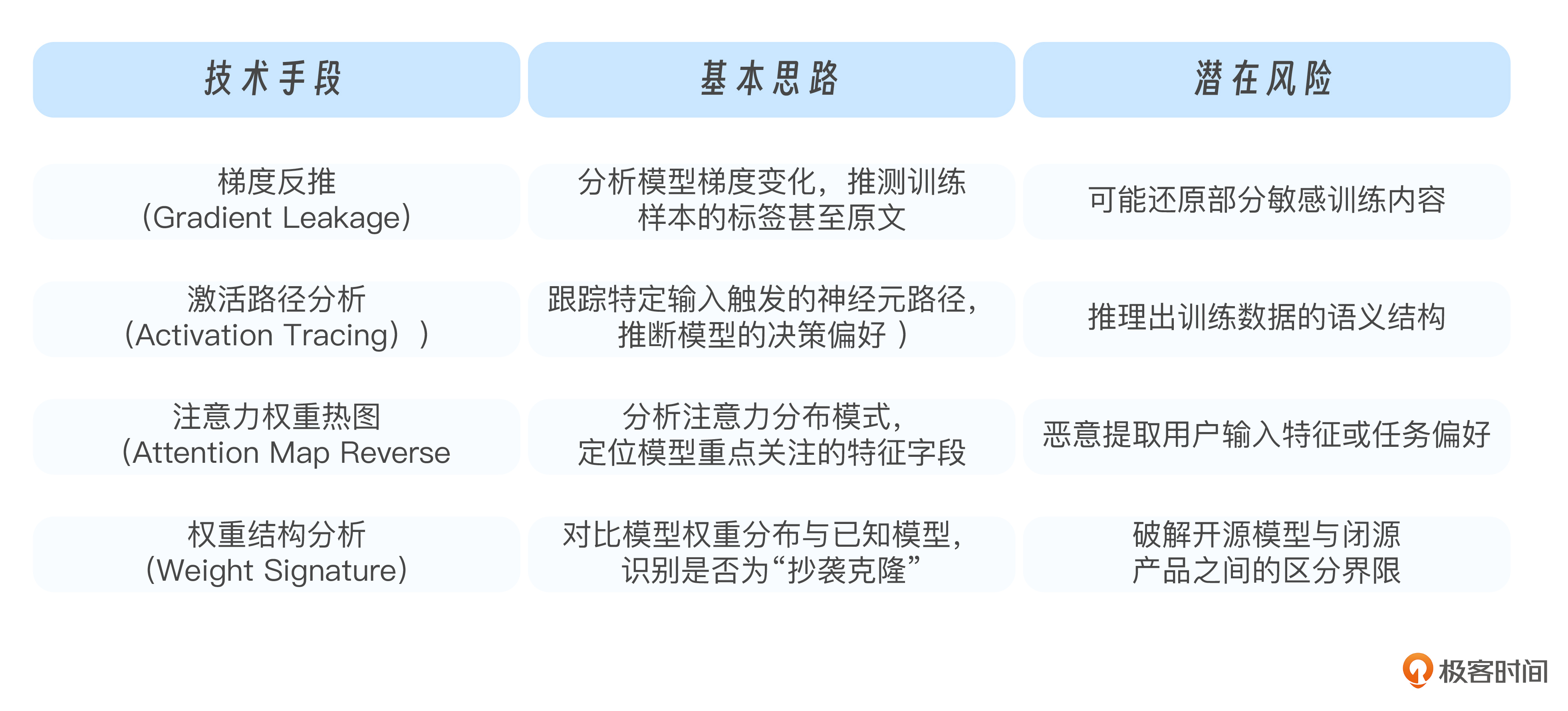 除了这两种主流方式,还有一些更高级的逆向攻击方式。攻击者不满足于“模仿能力”或“复制结构”,他们会尝试深入模型的运行机制,比如分析注意力权重分布、观测梯度变化,甚至追踪模型在特定输入下的激活路径。目的是从这些“反应模式”中反推出模型训练数据的结构、偏好,甚至部分原始样本。