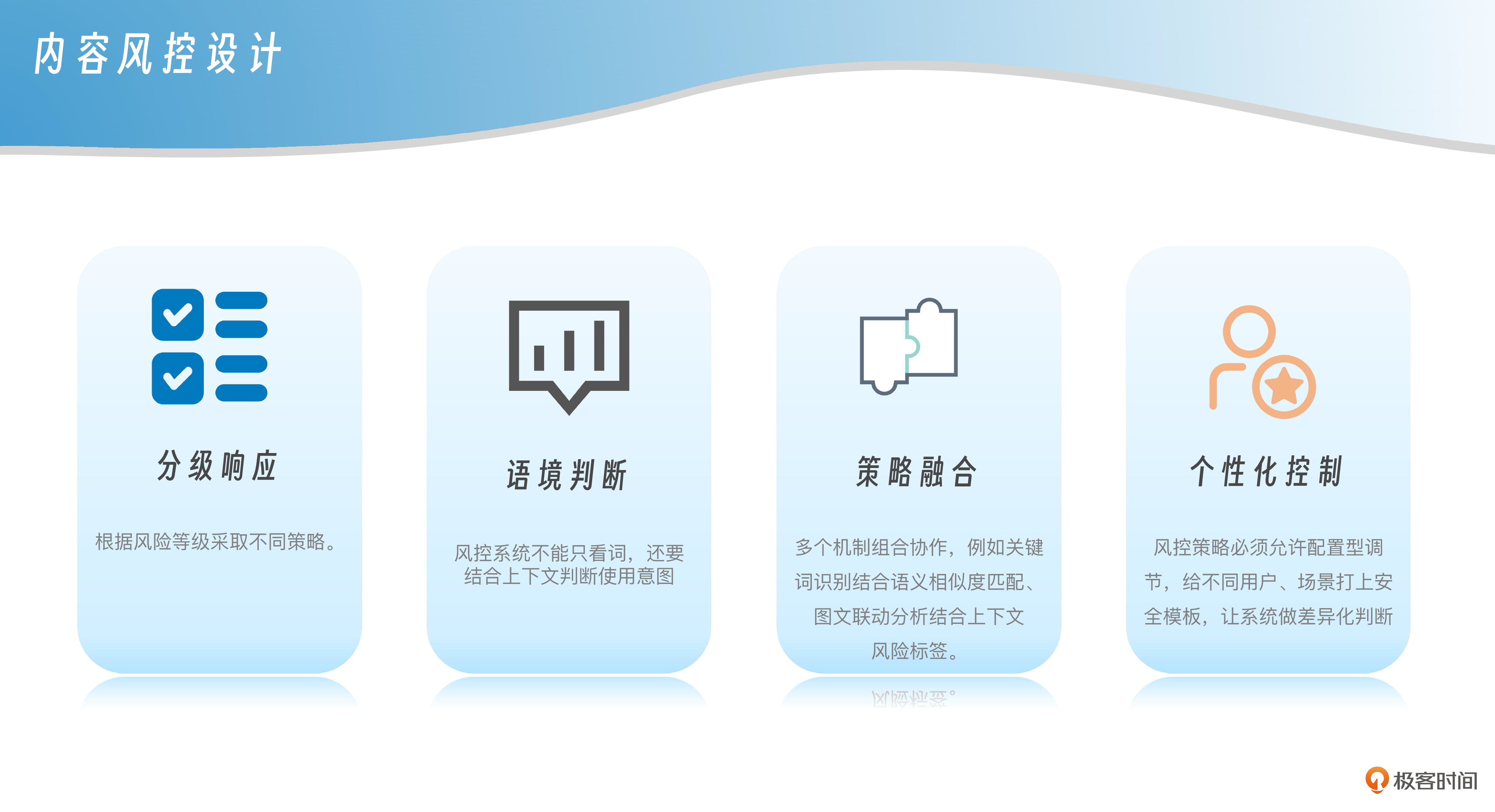 最后,在风控设计的部分,我们强调了“分级策略”“语境理解”“策略融合”和“个性化控制”几个关键词。一言以蔽之就是不能只防住风险,更要保住体验。你要有能力让模型在面对灰色表达时不慌乱、不越界,同时还能给出清晰、可控、合规的回应。