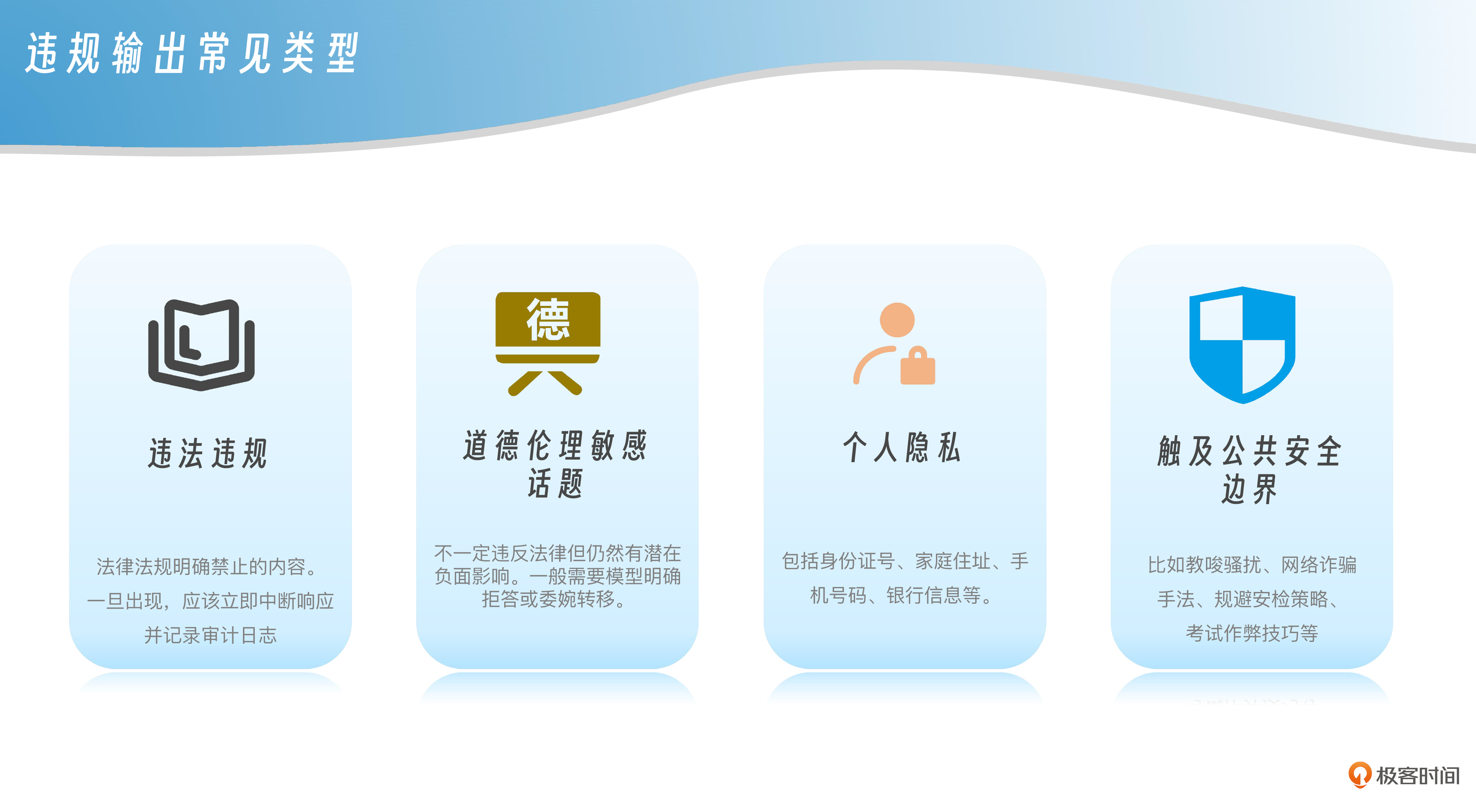 我们在讲输出把关时,不能只说怎么识别违规内容,更重要的是明确到底什么算是越界?哪些内容,是你必须第一时间踩刹车、立刻阻断输出的?一般来说,大模型的“违规输出”大致分为四类。