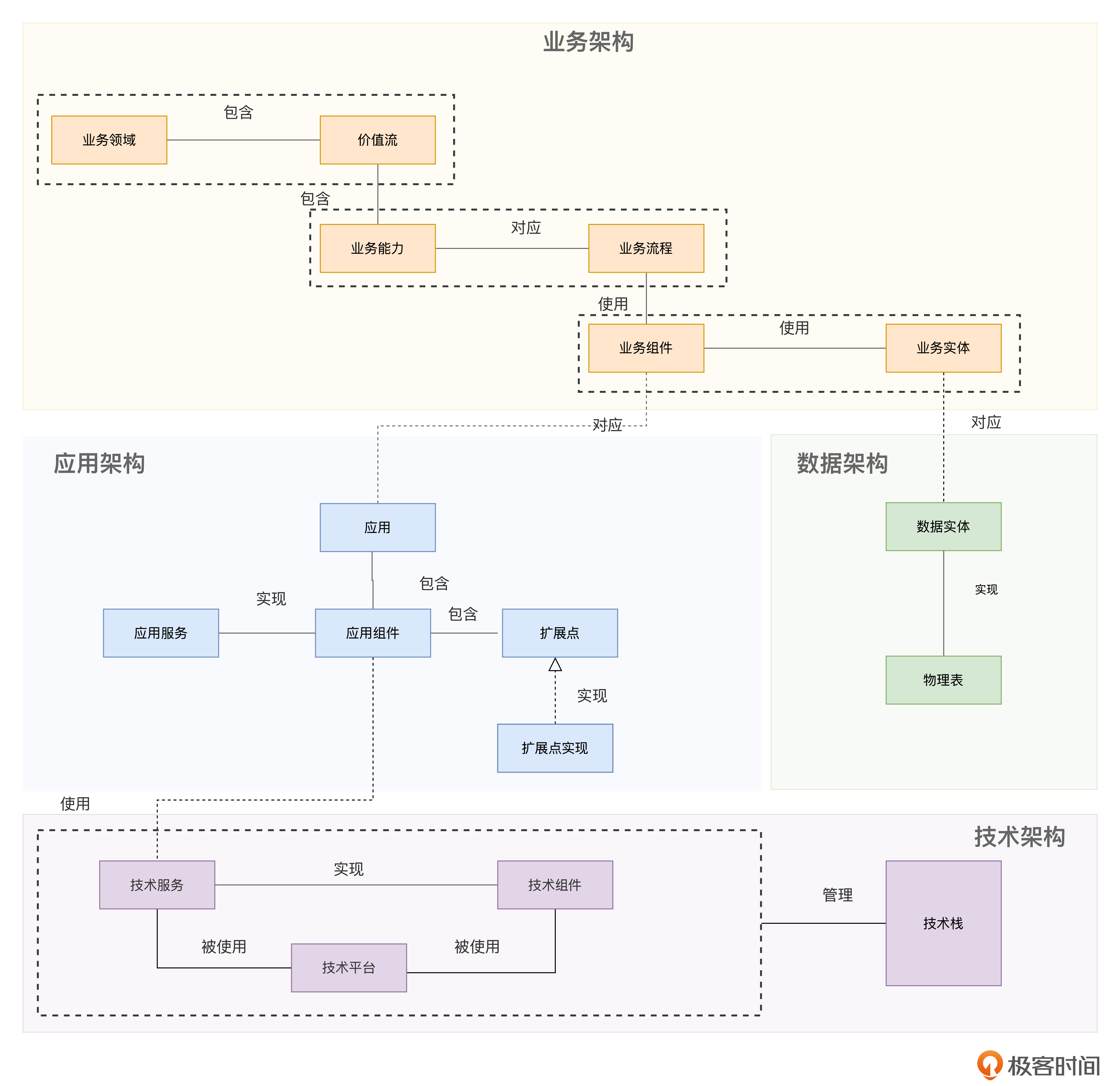 为了方便你对比学习,我们不妨先回顾一下传统企业架构的框架,再来探讨为什么需要建设智能原生时代的新框架。